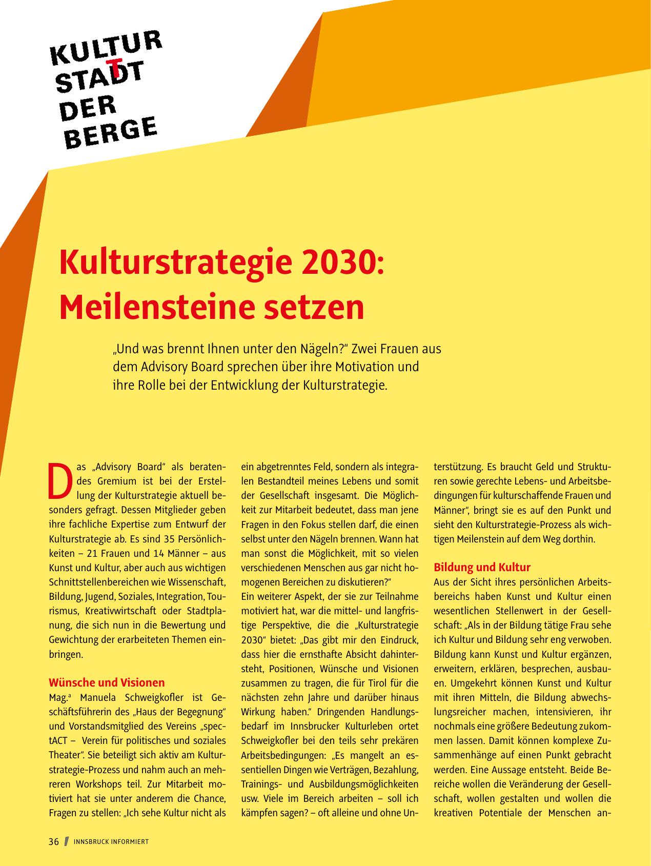 Theater“. Sie beteiligt sich aktiv am Kulturstrategie-Prozess und nahm auch an mehreren Workshops teil. Zur Mitarbeit motiviert hat sie unter anderem die Chance,