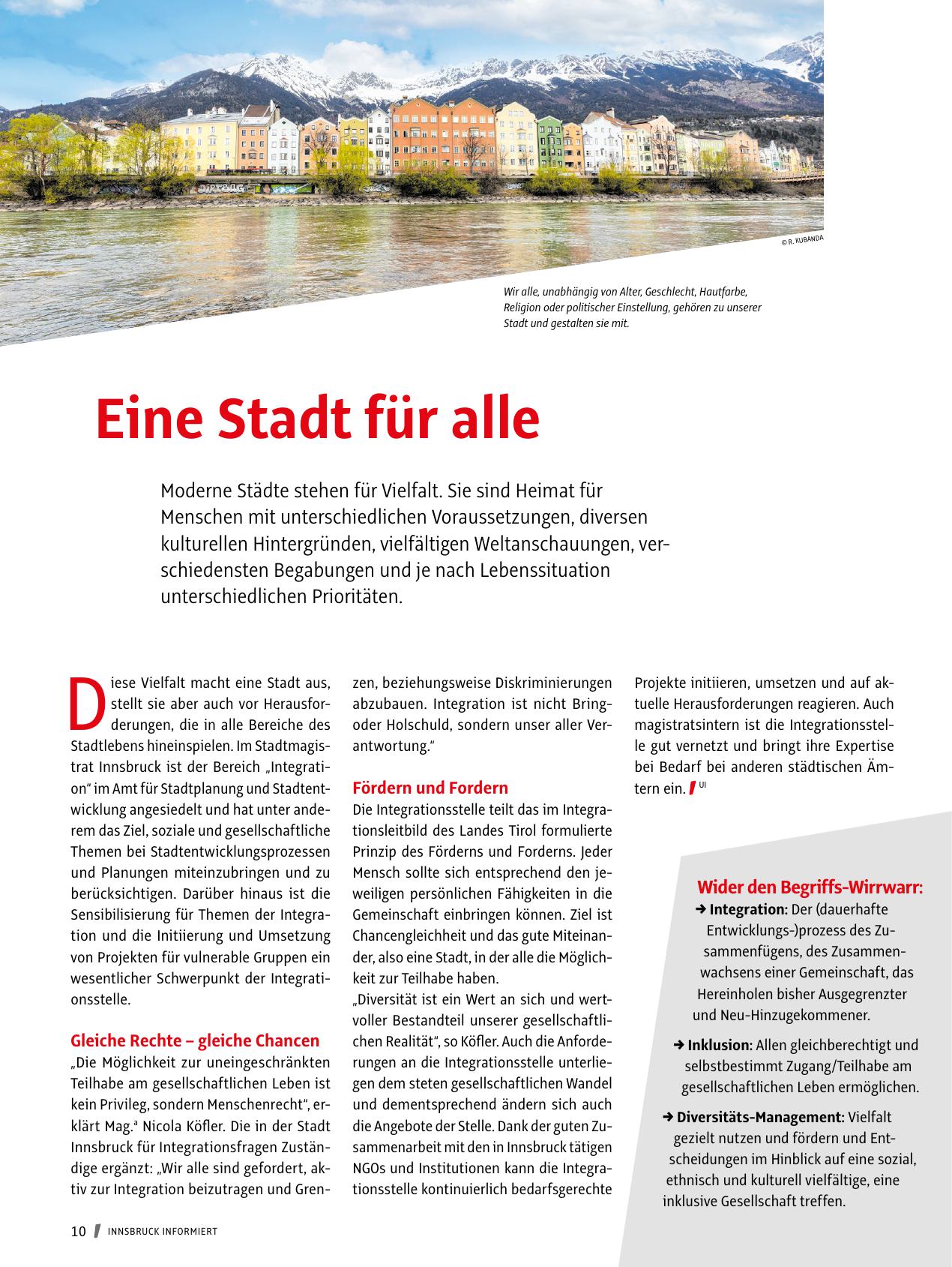 Stadtlebens hineinspielen. Im Stadtmagistrat Innsbruck ist der Bereich „Integration“ im Amt für Stadtplanung und Stadtentwicklung angesiedelt und hat unter anderem das Ziel, soziale und gesellschaftliche