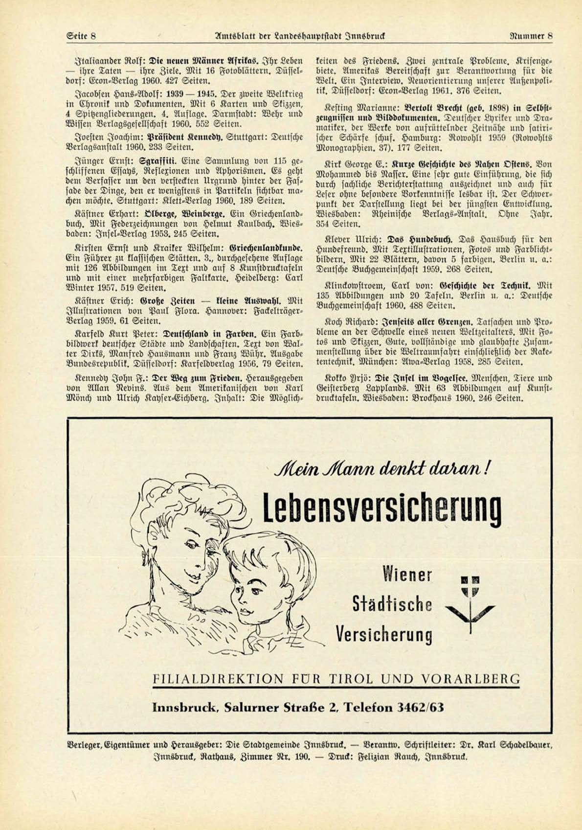 Verleger, Eigentümer und Herausgeber: Die Stadtgemeinde Innsbruck. — Verantw. Schriftleiter: Nr. Karl Schadelbauer,