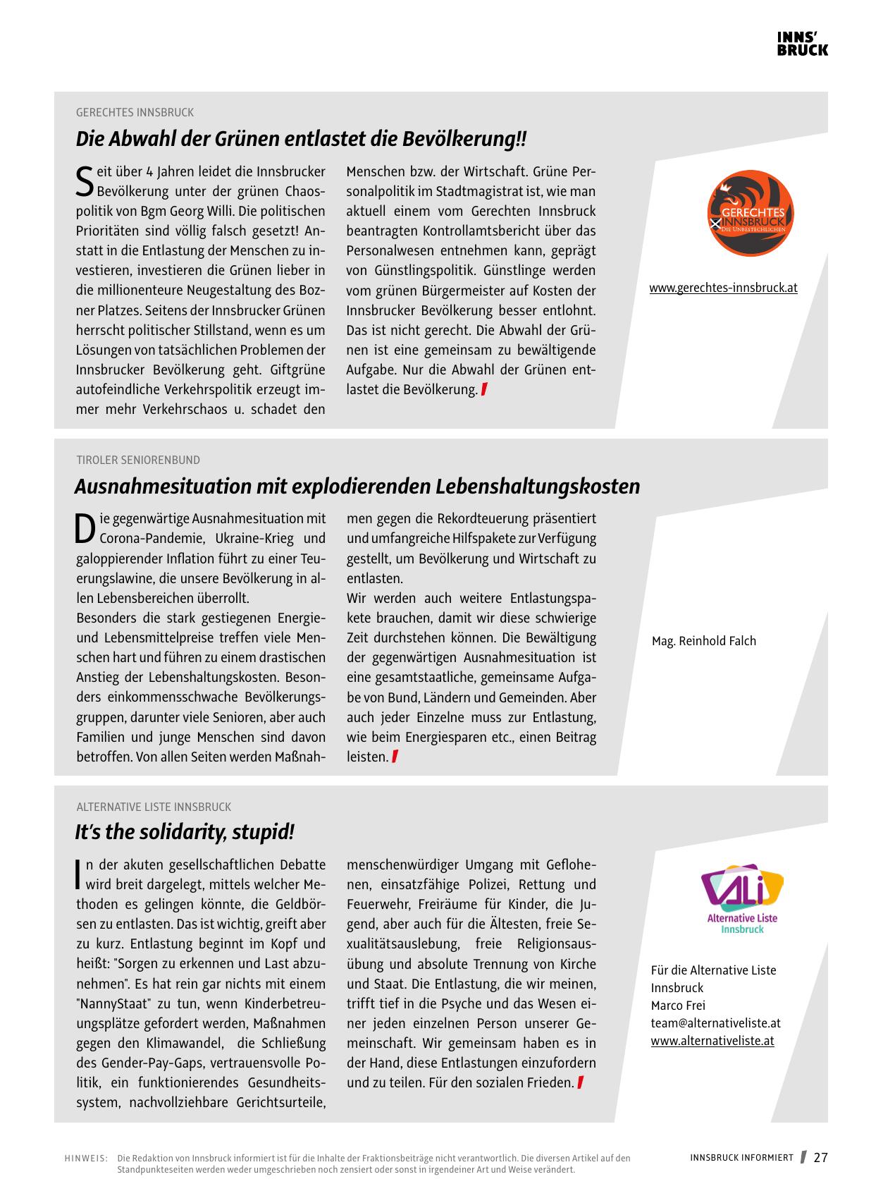 H I N W EI S : Die Redaktion von Innsbruck informiert ist für die Inhalte der Fraktionsbeiträge nicht verantwortlich. Die diversen Artikel auf den