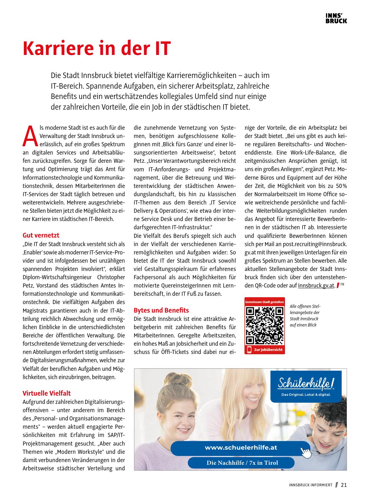 aktuellen Stellenangebote der Stadt Innsbruck finden sich über den untenstehenden QR-Code oder auf innsbruck.gv.at. FB