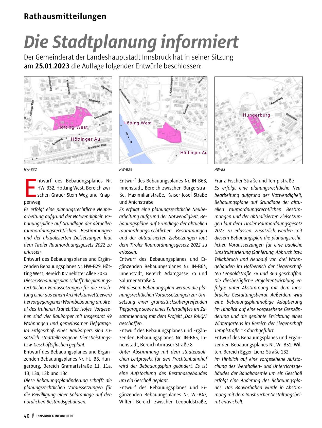 HW-B32, Hötting West, Bereich zwi- Innenstadt, Bereich zwischen Bürgerstra- Es erfolgt eine planungsrechtliche Neuschen Grauer-Stein-Weg und Knap- ße, Maximilianstraße, Kaiser-Josef-Straße bearbeitung aufgrund der Notwendigkeit,