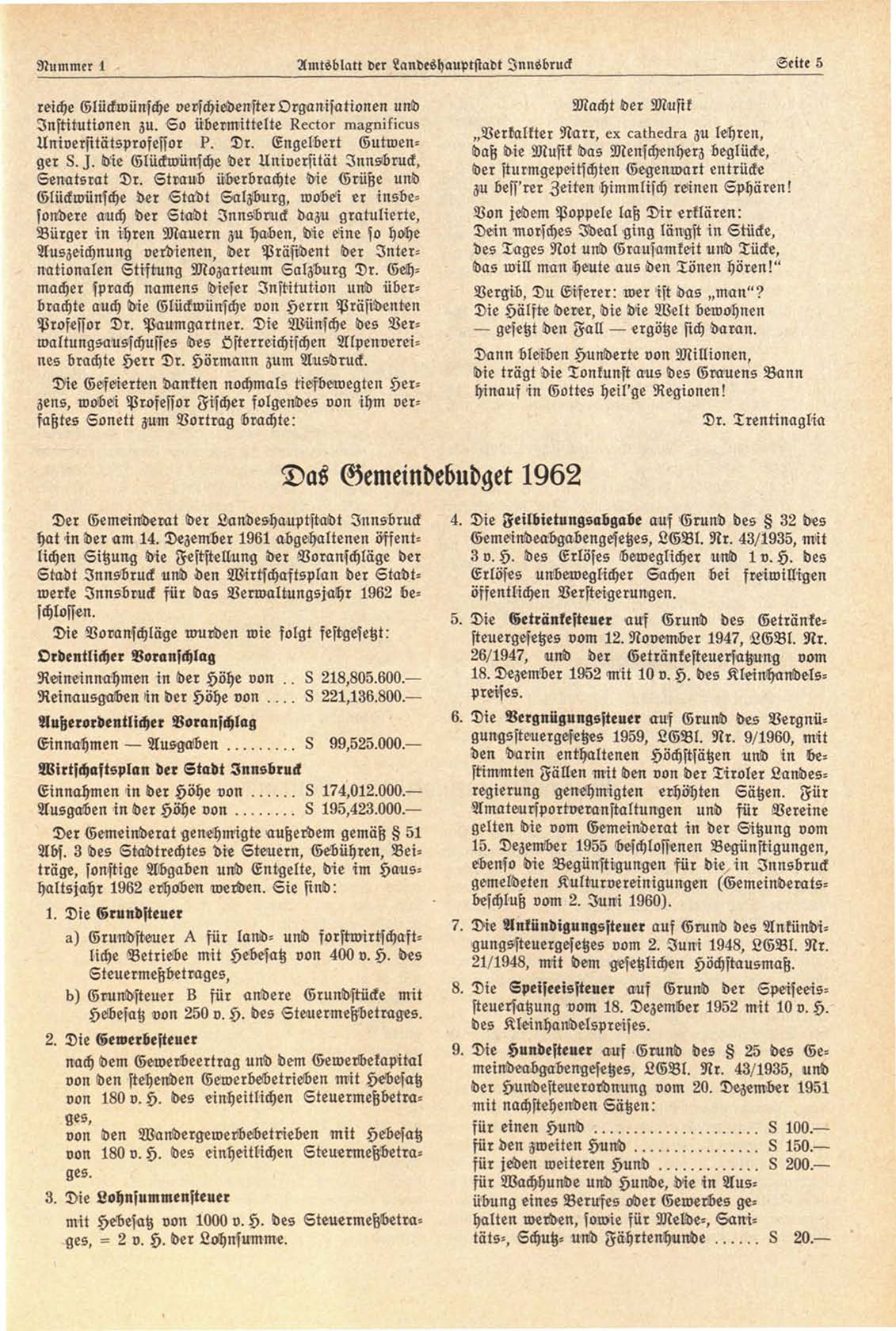Stadt Innsbruck und den Wirtschaftsplan der Stadtwerke Innsbruck für das Verwaltungsjahr 1962 beschlossen.