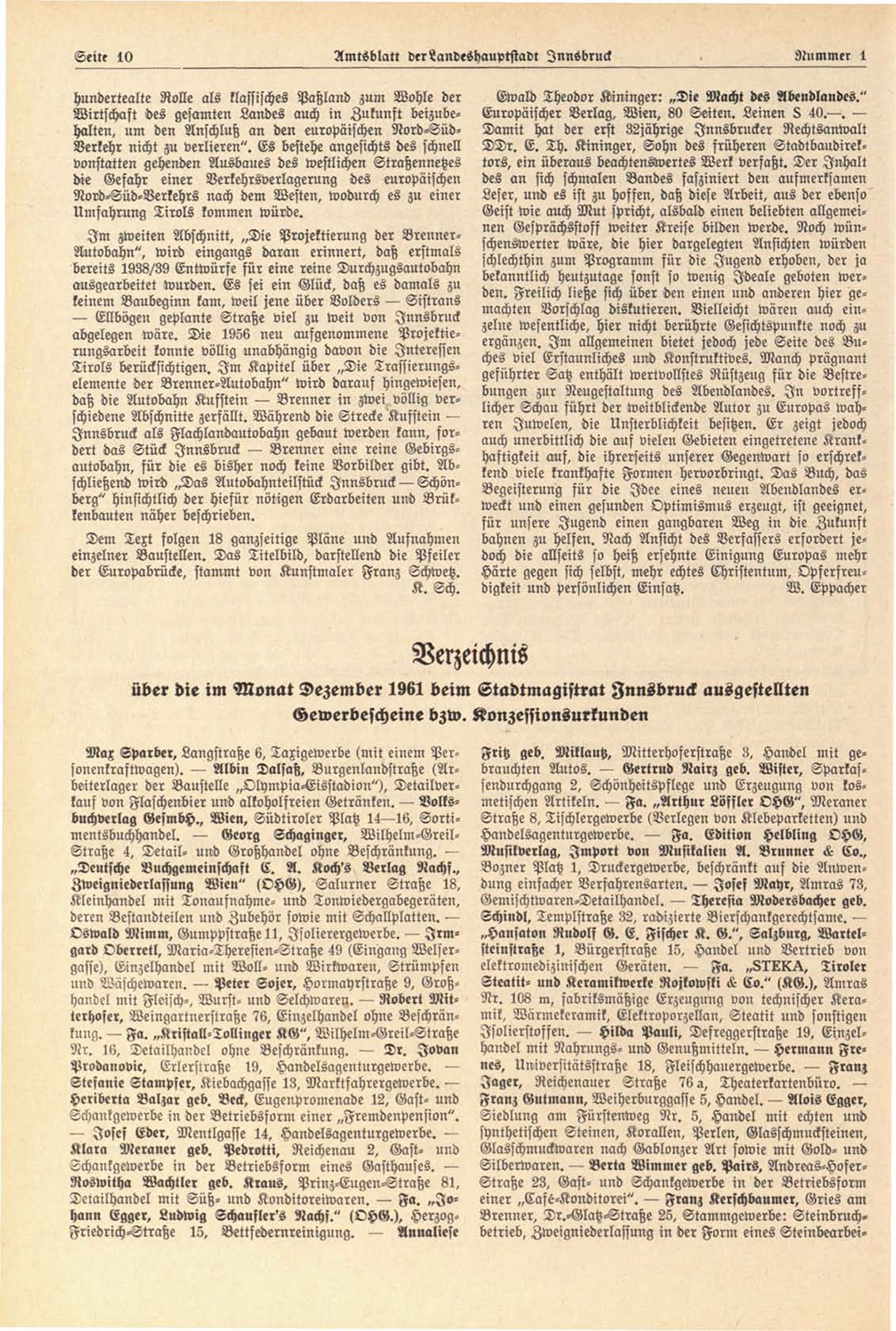 über die im Monat Dezember 1961 beim Stadtmagistrat Innsbruck ausgestellten