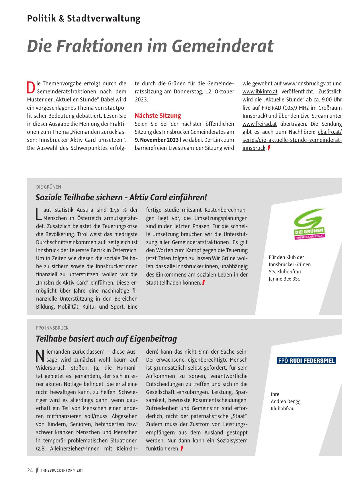 in dieser Ausgabe die Meinung der Fraktionen zum Thema „Niemanden zurücklassen: Innsbrucker Aktiv Card umsetzen!".