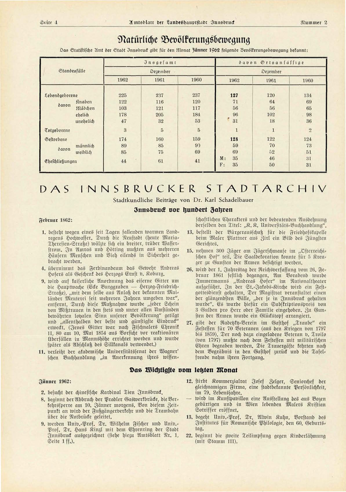 Statistische Amt öer Stadt Innsbruck gibt für ^e>^ iNonat Männer 1^62 folgende