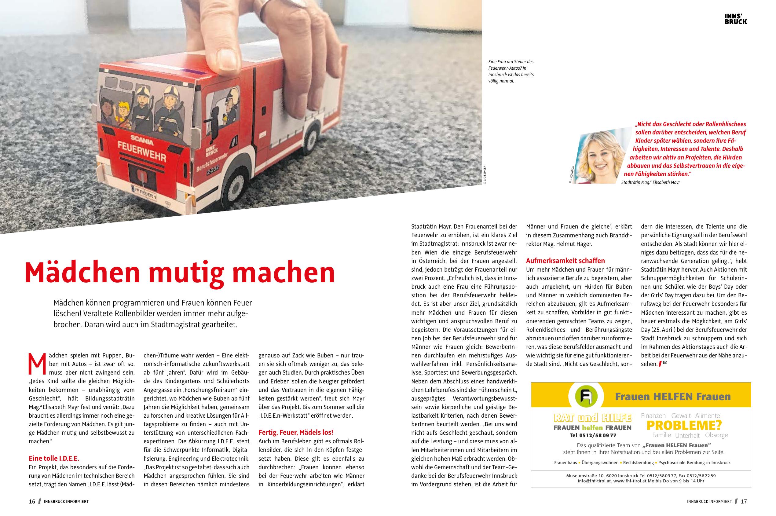 zwei Prozent. „Erfreulich ist, dass in Innsbruck auch eine Frau eine Führungsposition bei der Berufsfeuerwehr bekleidet. Es ist aber unser Ziel, grundsätzlich