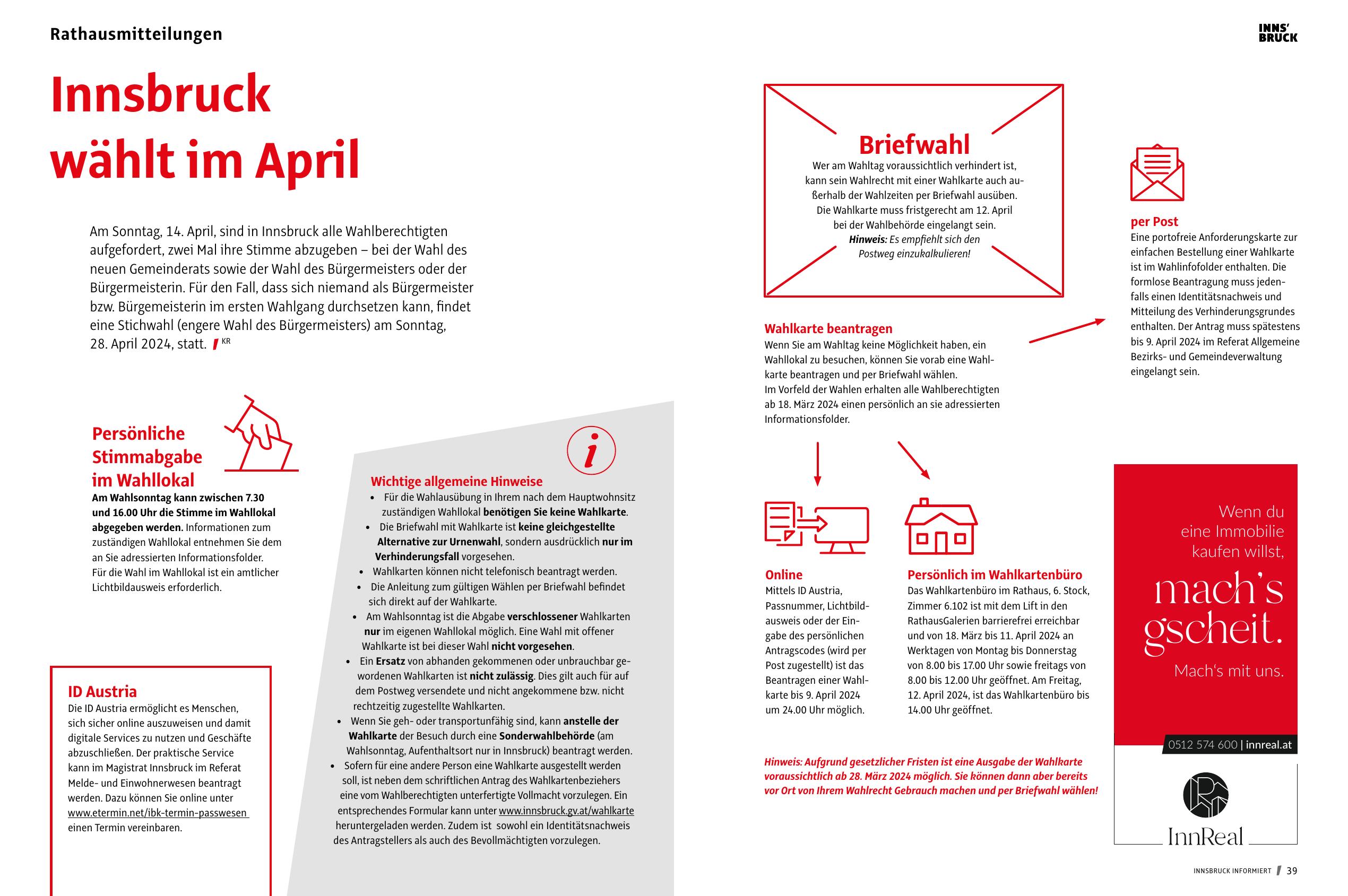 Am Sonntag, 14. April, sind in Innsbruck alle Wahlberechtigten