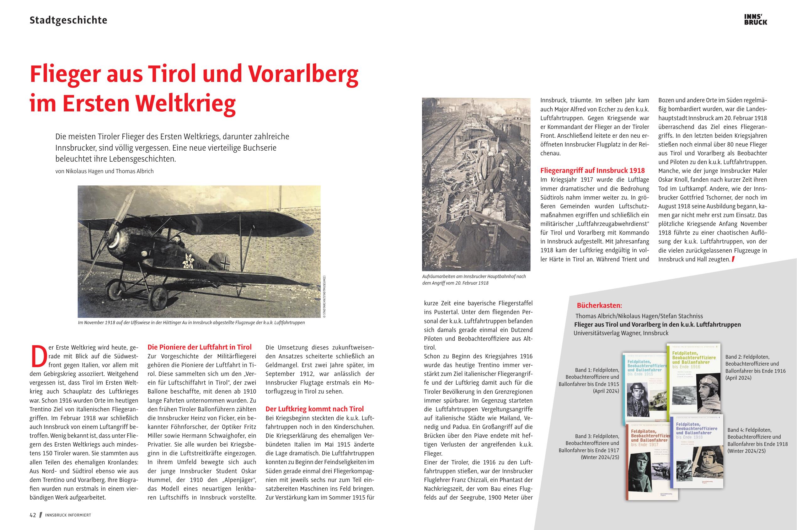 auch Innsbruck von einem Luftangriff betroffen. Wenig bekannt ist, dass unter Fliegern des Ersten Weltkriegs auch mindestens 150 Tiroler waren. Sie stammten aus