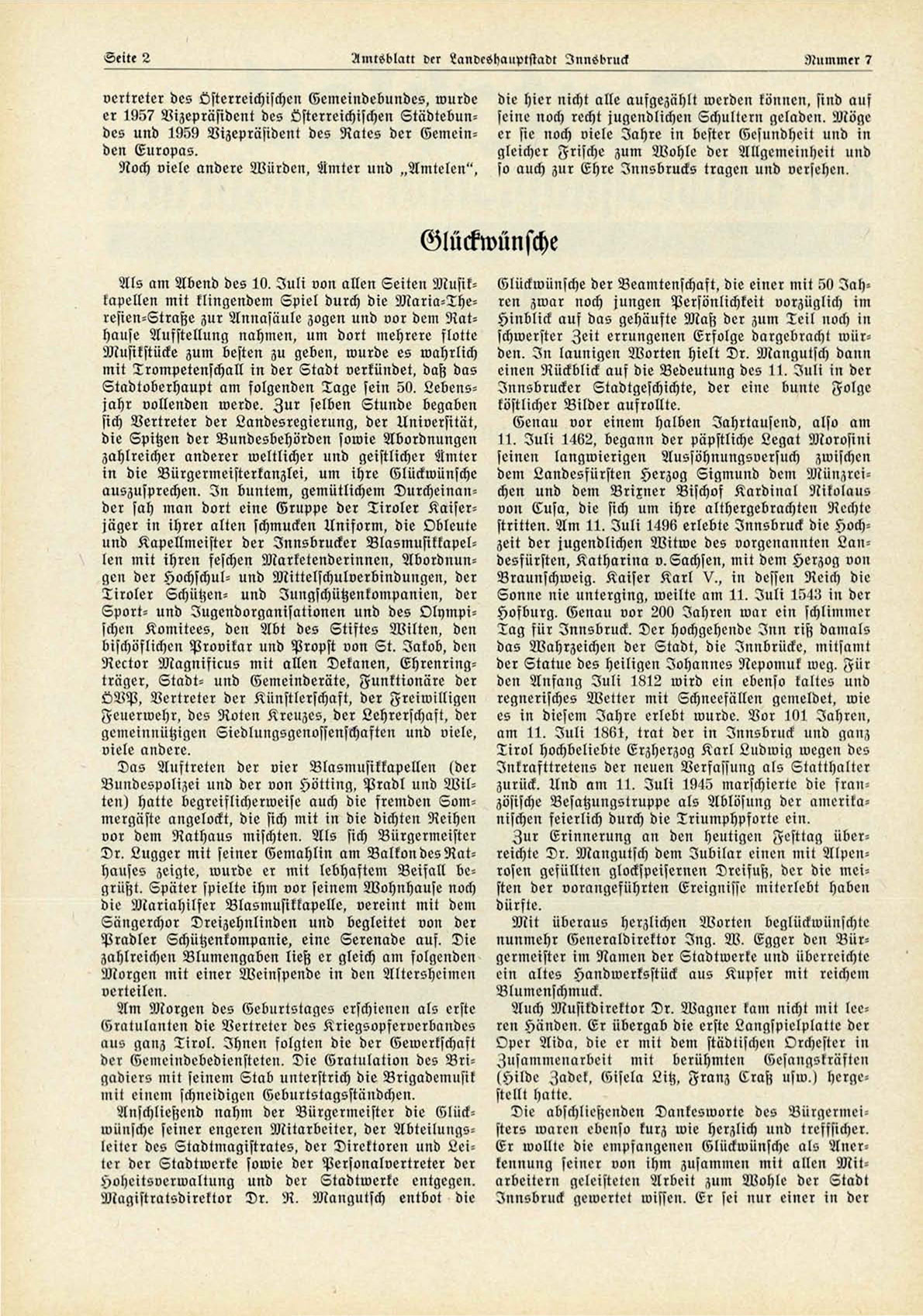 Als am Abend des 10. Juli von allen Seiten Musikkapellen mit klingendem Spiel durch die Maria-Theresien-Straße zur Annasäule zogen und vor dem Nathause Aufstellung nahmen, um dort mehrere flotte