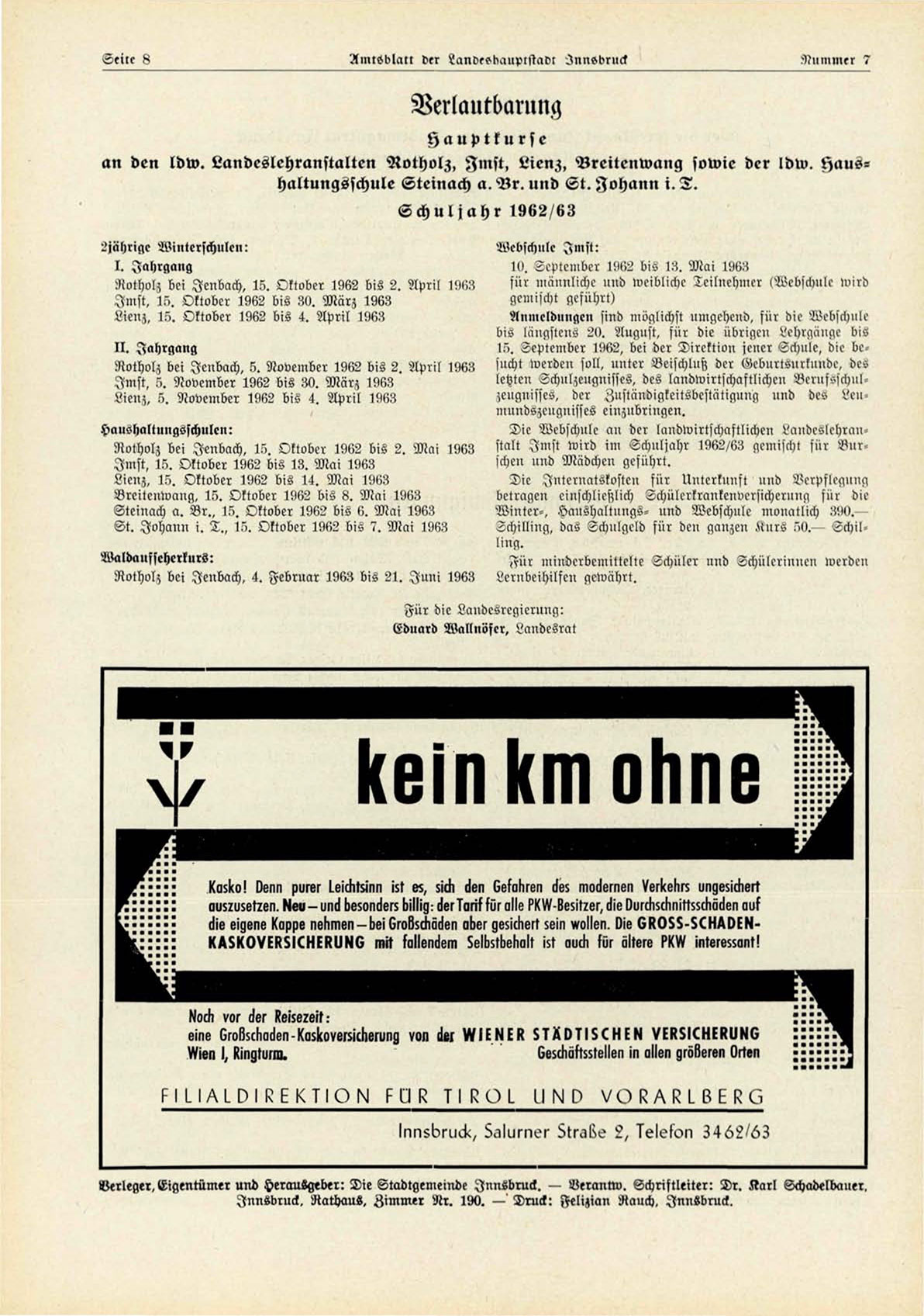 »Verleger, Eigentümer und Herausgeber: Die Stadtgemeindc Innsbruck. - Berantw. Schriftleiter: Dr. Karl Schadellxniei,