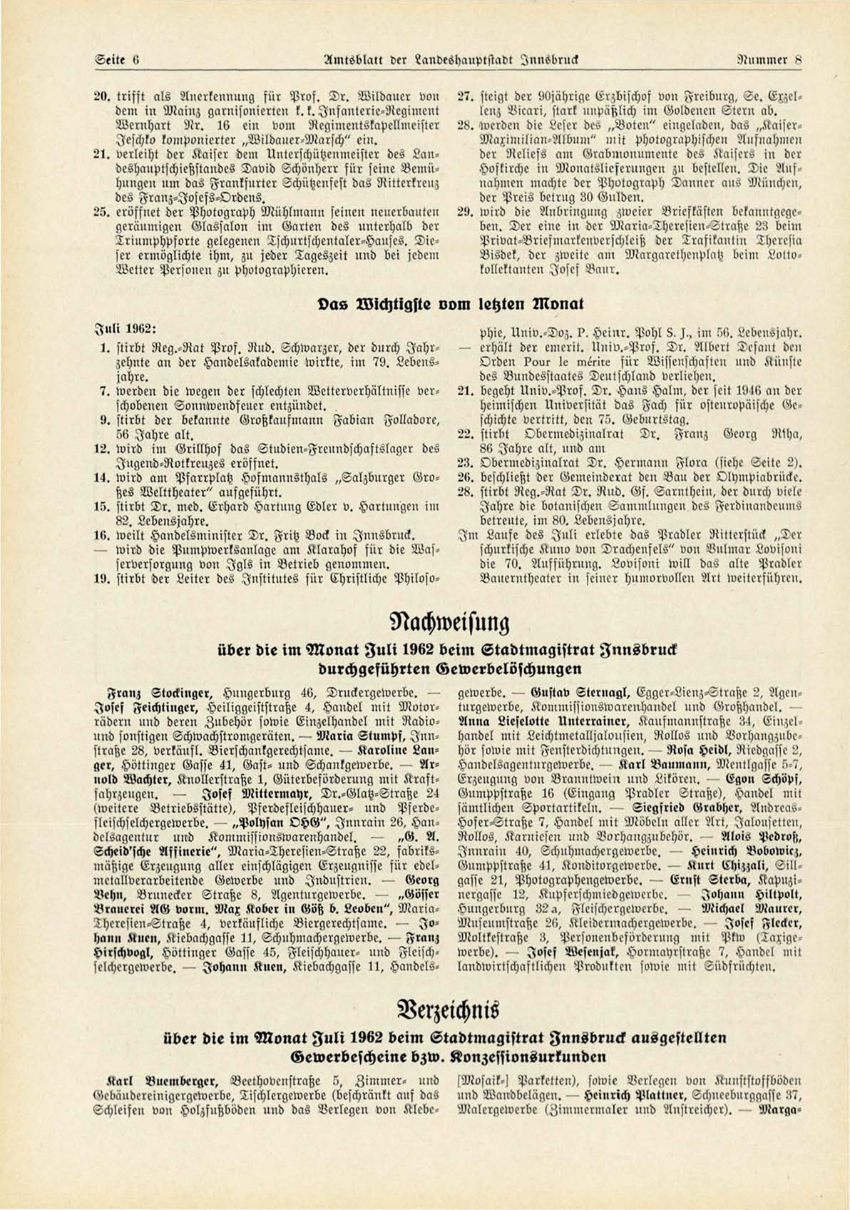 über die im Monat Fuli 1962 beim Stadtmagistrat Innsbruck ausgestellten