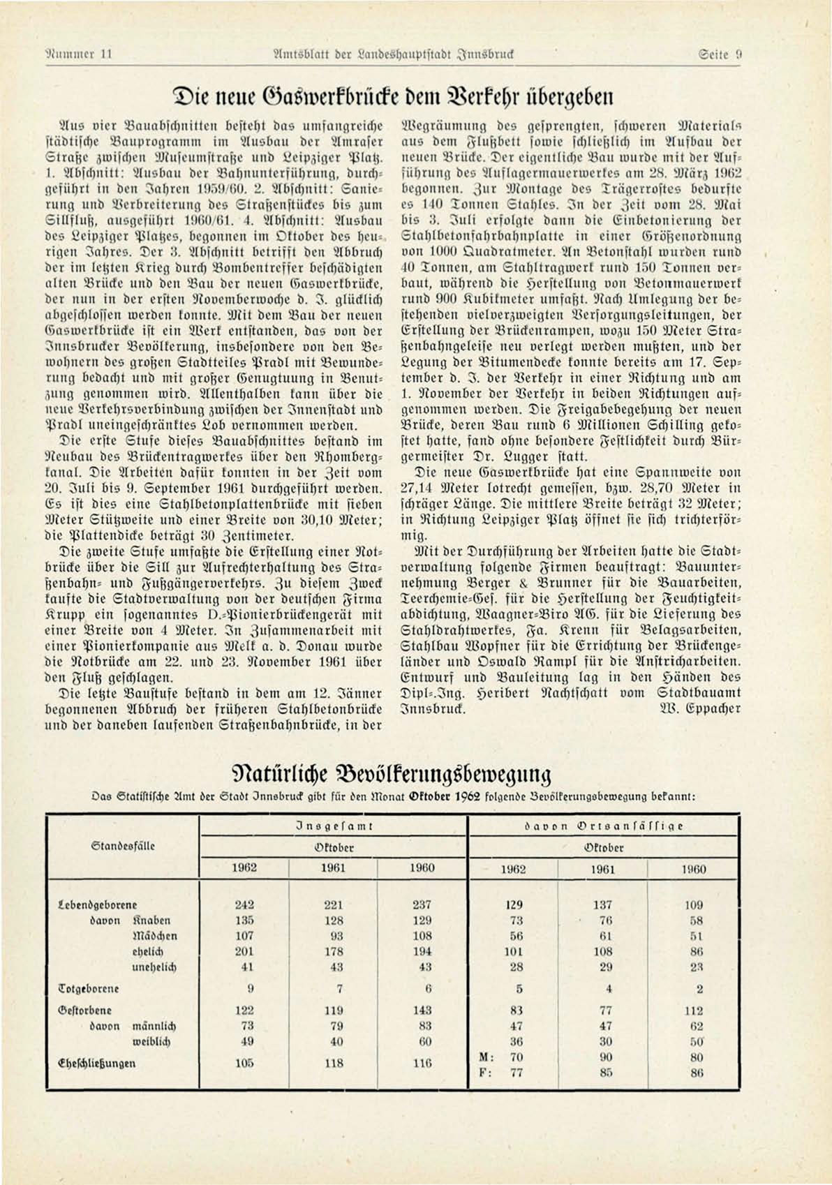 Oas Statistische Amt der Stadt Innsbruck gibt für den Monat Oktober 1^62 folgende ^evölkerungobewegung bekannt: