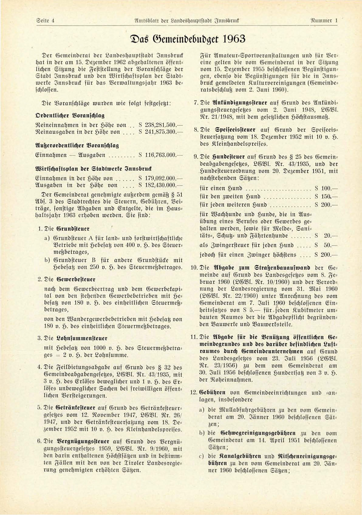Stadt Innsbruck nnd den ^^irlschastsplan der Sladlwerte Innsbrlick für das Verwallnngsjalir 1963 beschlossen.