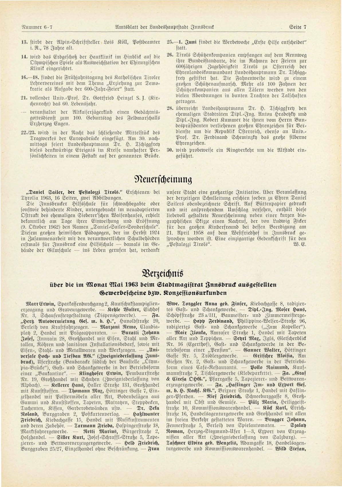 über die im Monat M a i 1963 beim Stadtmagistrat Innsbruck ausgestellten
