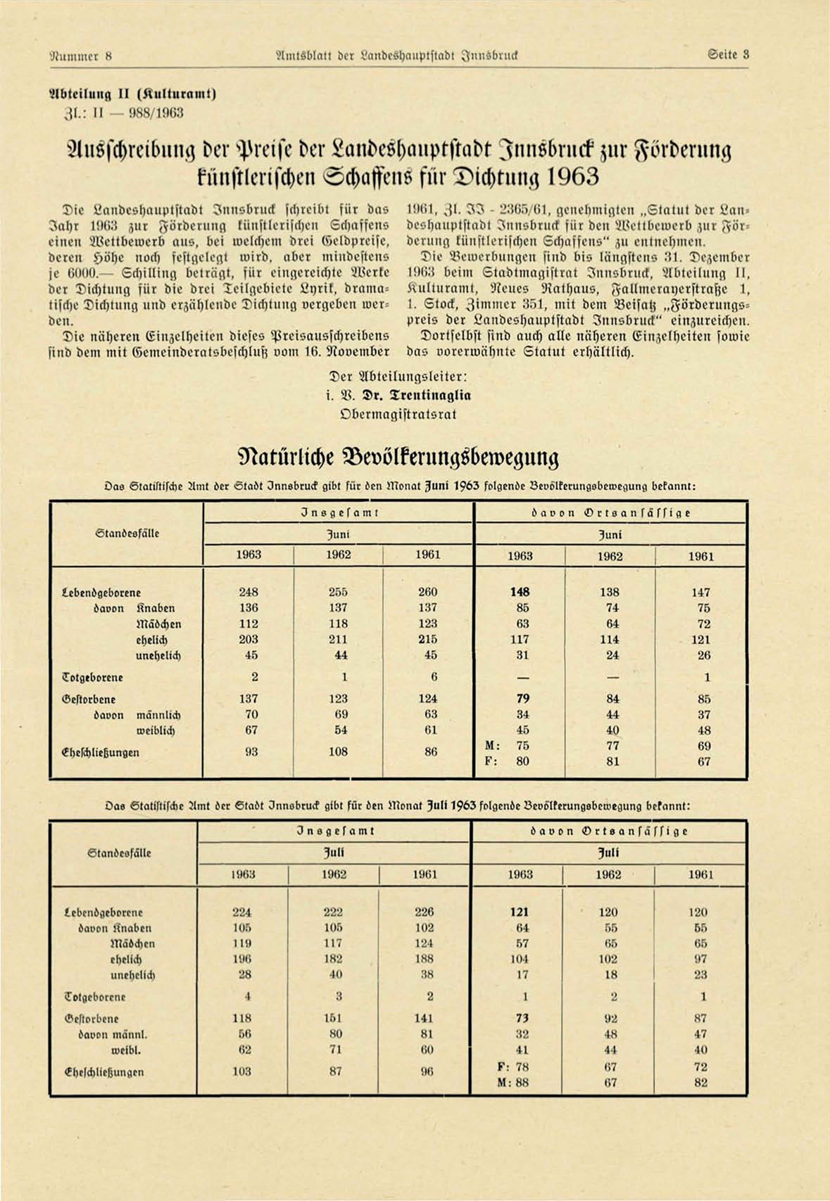 Oao Statistische Amt der Staöt Innsbruck gibt für den Monat Zuni 1^63