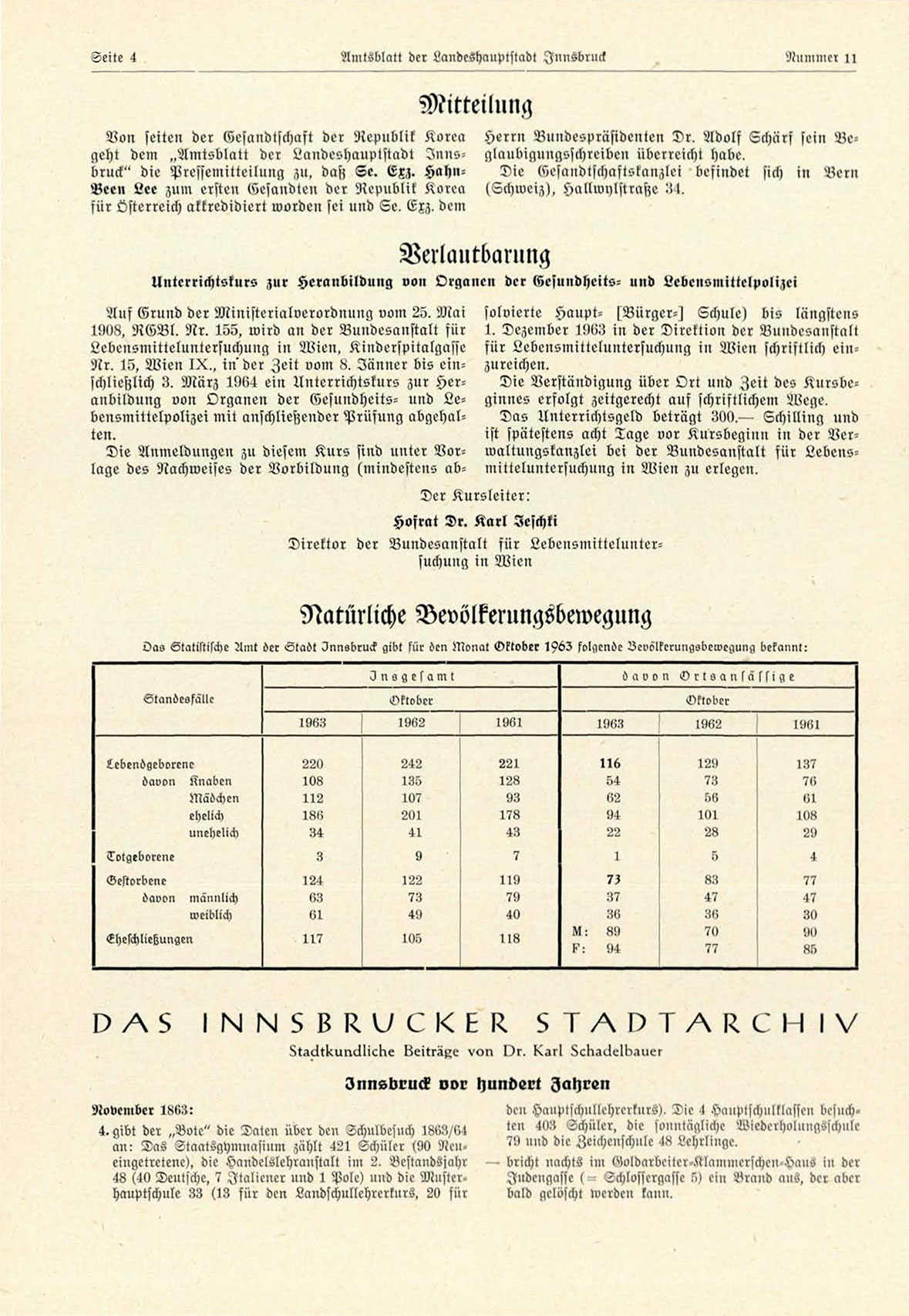Oas Statistische Amt ber ötadt Innsbruck gibt für den Monat Oktober 1963 folgende Zevölkerungobcwcaung bekannt: