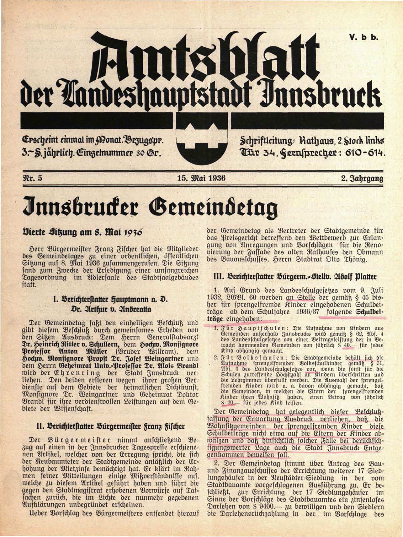 Der B ü r g e r m e i s t e r nimmt anschließend Bezug auf einen in der Innsbrucker Tagesvresse erschienenen Artikel, welcher von der Erregung spricht, die sich