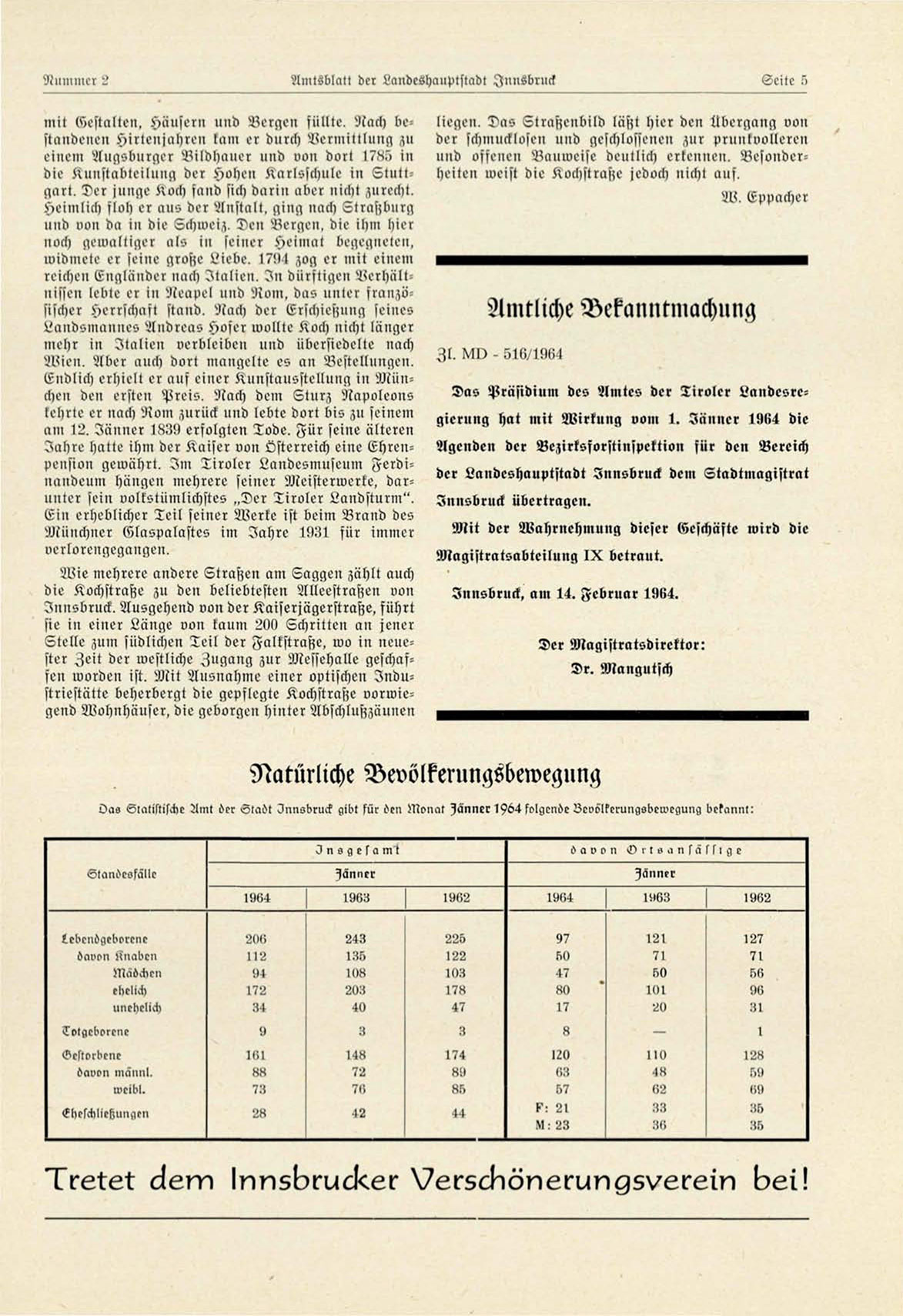Statistische Amt öcr Stadt Innsbruck gibt für öen Monat Männer 1^64 folacuöe üeoölkerungsbcwegung