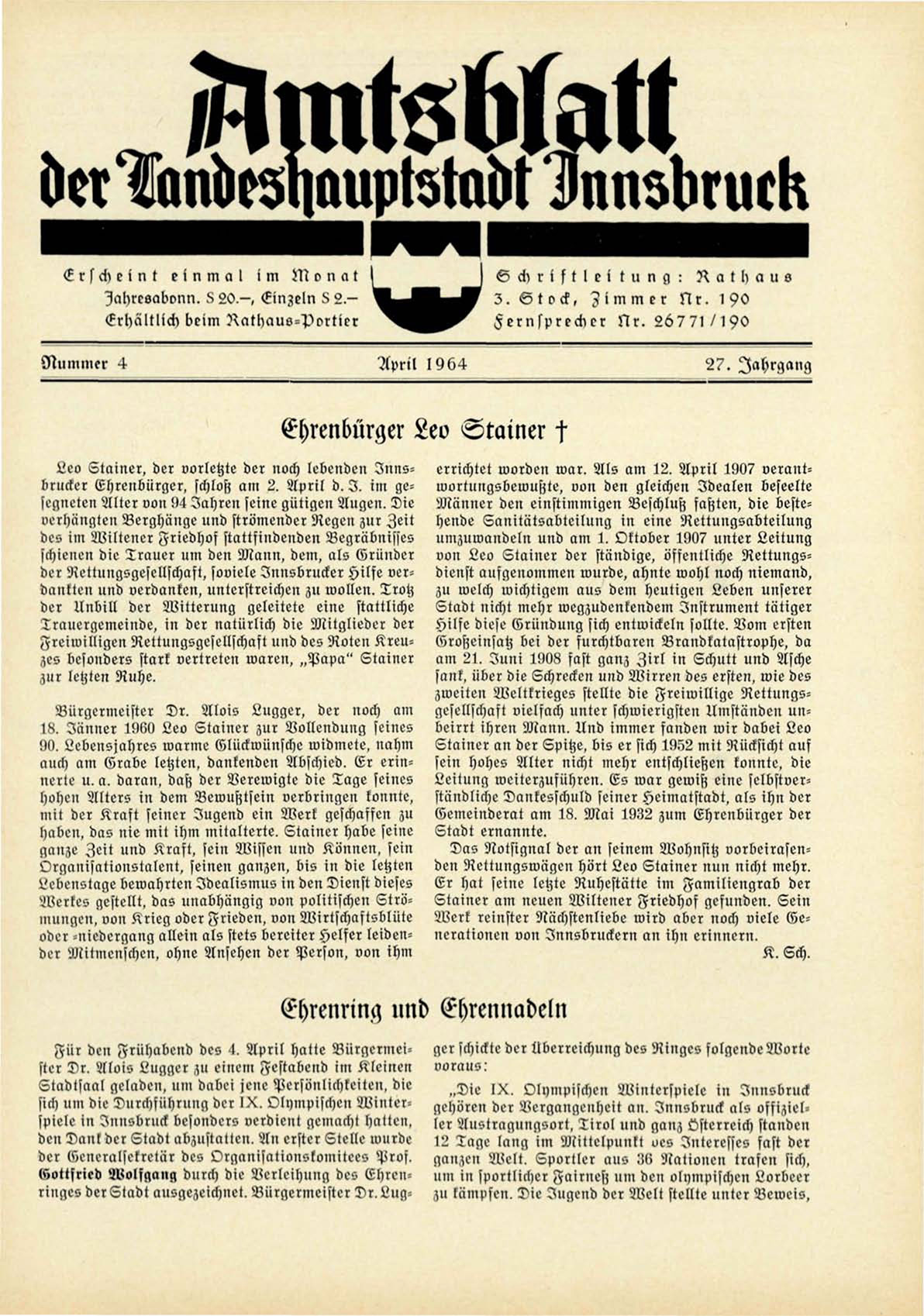Leo Stainer, der vorletzte der noch lebenden Innsbrucker Ehrenbürger, schloß am 2. April d. I . im gesegiieten Alter von 94 Jahren seine gütigen Augen. Die