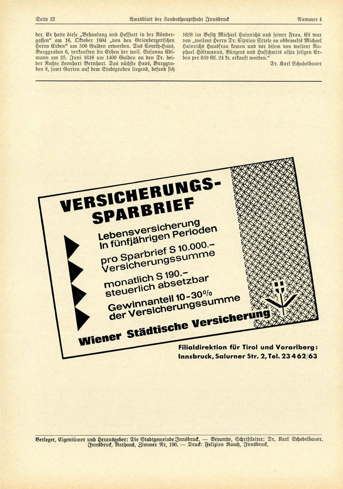 Verleger, Eigentümer und Herausgeber: Die Stadtgemeinde Innsbruck. — Verantw. Schriftleiter: D r . K a r l Schadelbauer,
