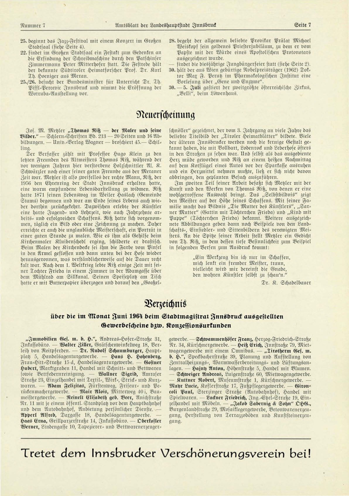 über die im Monat Funi 196^ beim Stadtmagistrat Innsbruck ausgestellten