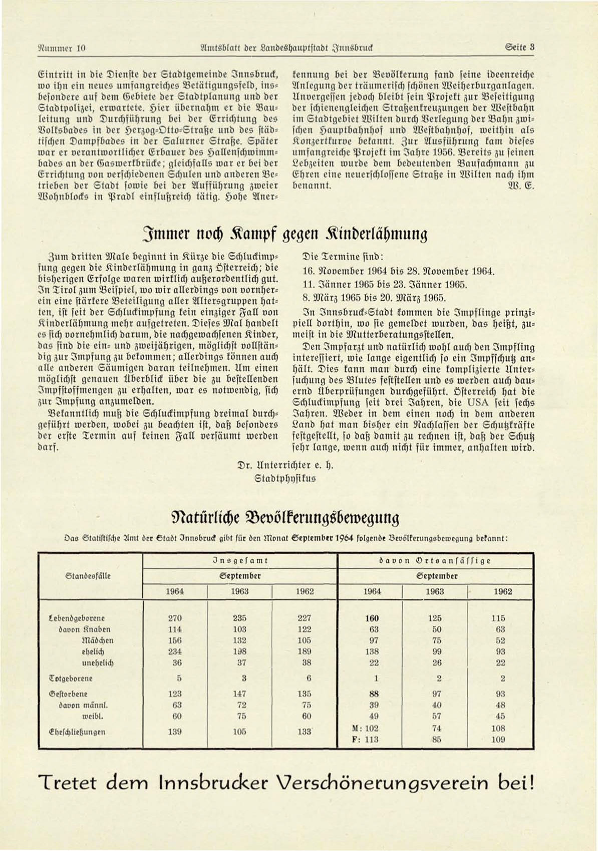 Oas Statistische Amt der Stadt Innsbruck gibt für den Monat September 1Y64 folgende Bevölkerungsbewegung bekannt: