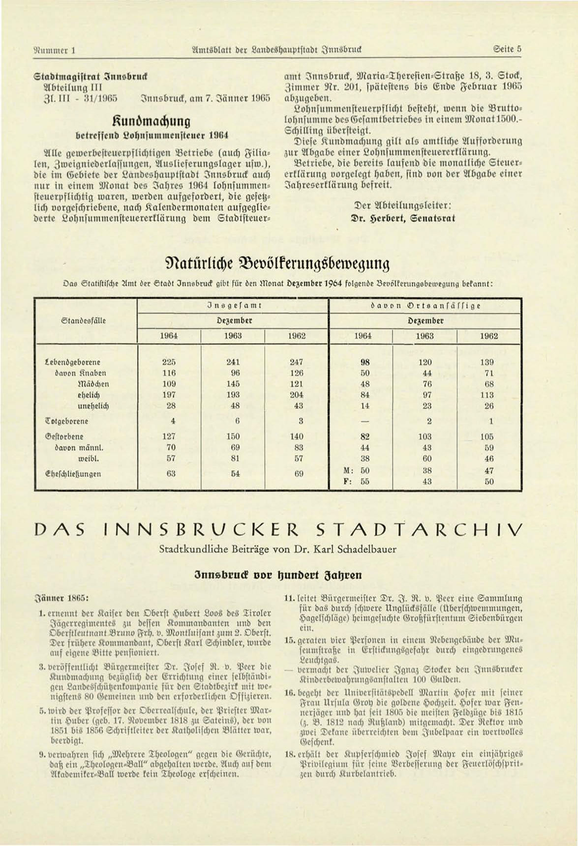 Oas Statistische Amt öcr Etaüt Innol"ruck gil,"t für den Monat dezember 1?b4 folgende Vevolkerungobe^e^un^ bekannt: