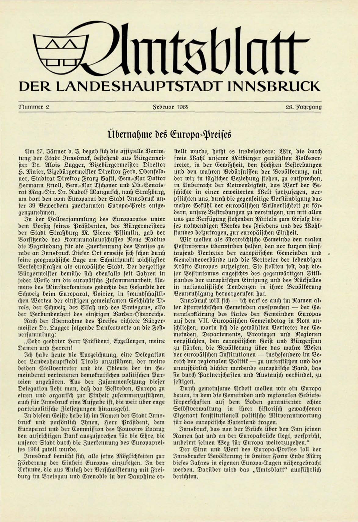 um dort den vom Europarat der Stadt Innsbruck unter Nl) Bewerbern zuerkannten Europa-Preis entgegenzunehmen.