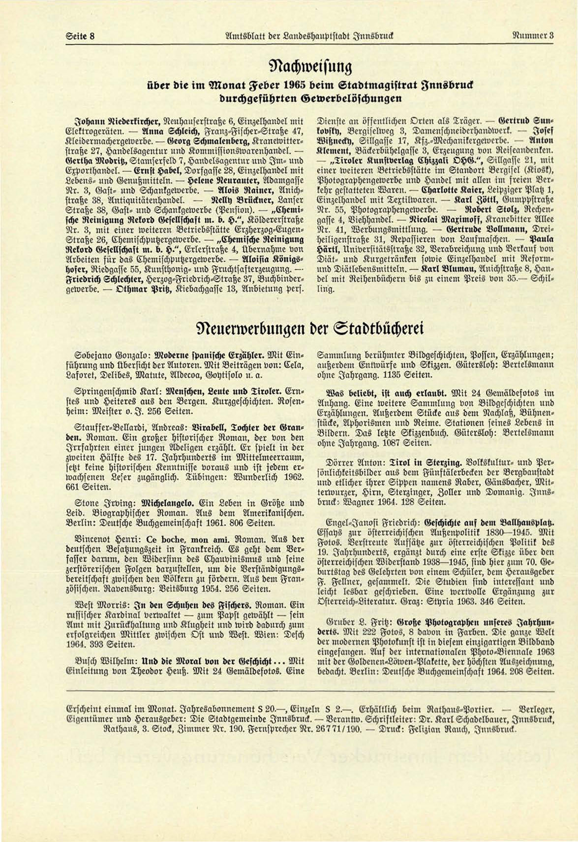 über die im Monat Feber 1965 beim Stadtmagistrat Innsbruck