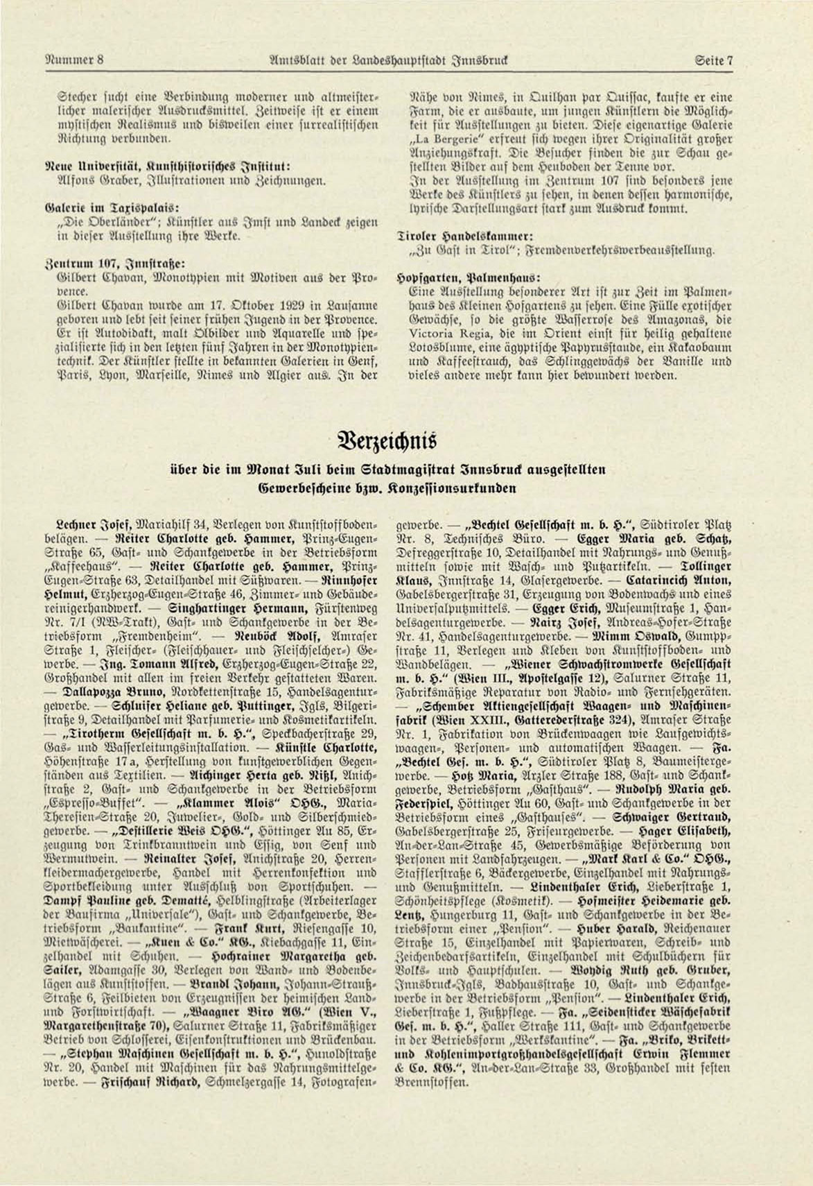 — Dallapozza Nruno, Nordkettenstraße 15, Handelsagenturgowerbe. - Tchluifer Heliane geb. Puttinger, I g l s , Bilgeristraße 9, Detailhandel mit Parfumerie- uud Kosmetikartikeln.