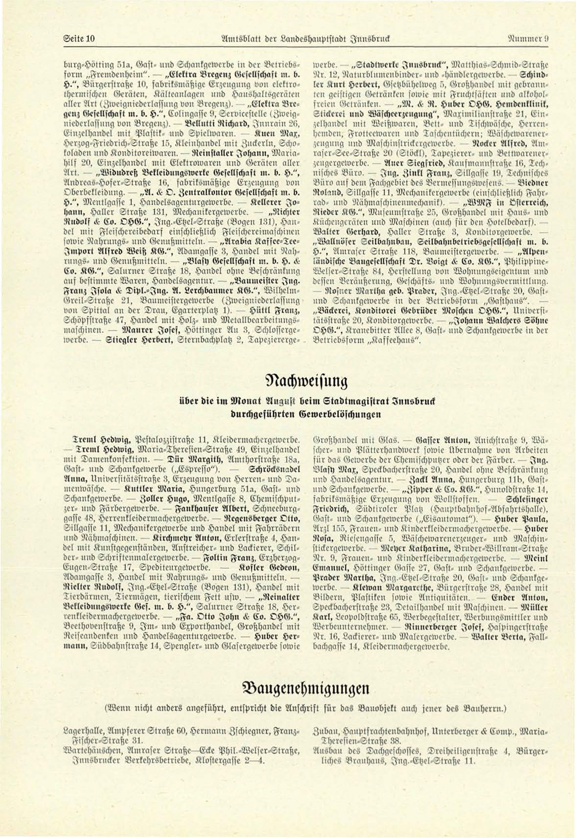 Schöftfstraße 47, Haudcl mit Holz- und Metallbearbeitungsmaschinen. — Maurer Josef, Höttinger Au 3, Schlossergcwerbe. — Stiegler Herbert, Sterubachplatz 2, Tapeziererge-