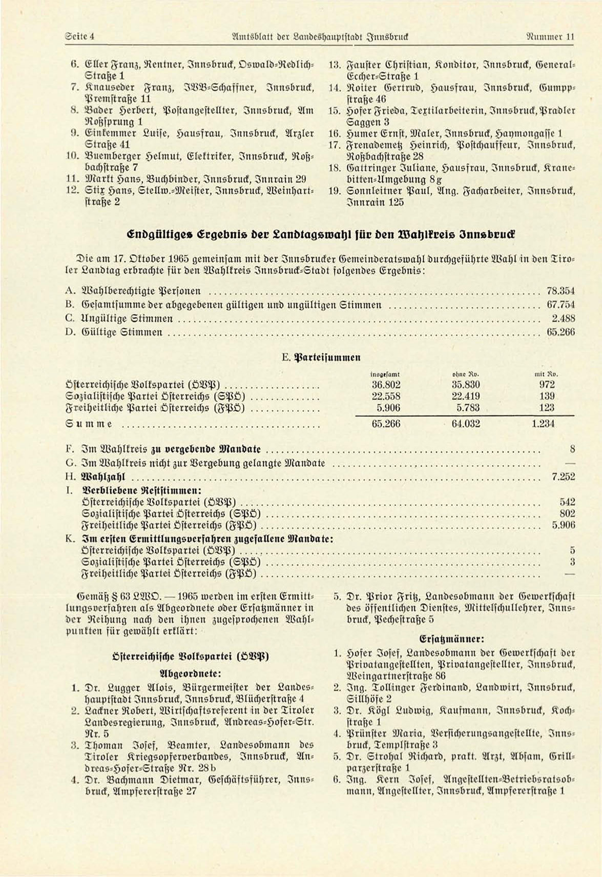 Die am 17. Oktober 1965 gemeinsam mit der Innsbrucker Gemeinderatswahl durchgeführte Wahl in den Tiroler Landtag erbrachte für den Wahlkreis Innsbruck-Stadt folgendes Ergebnis: