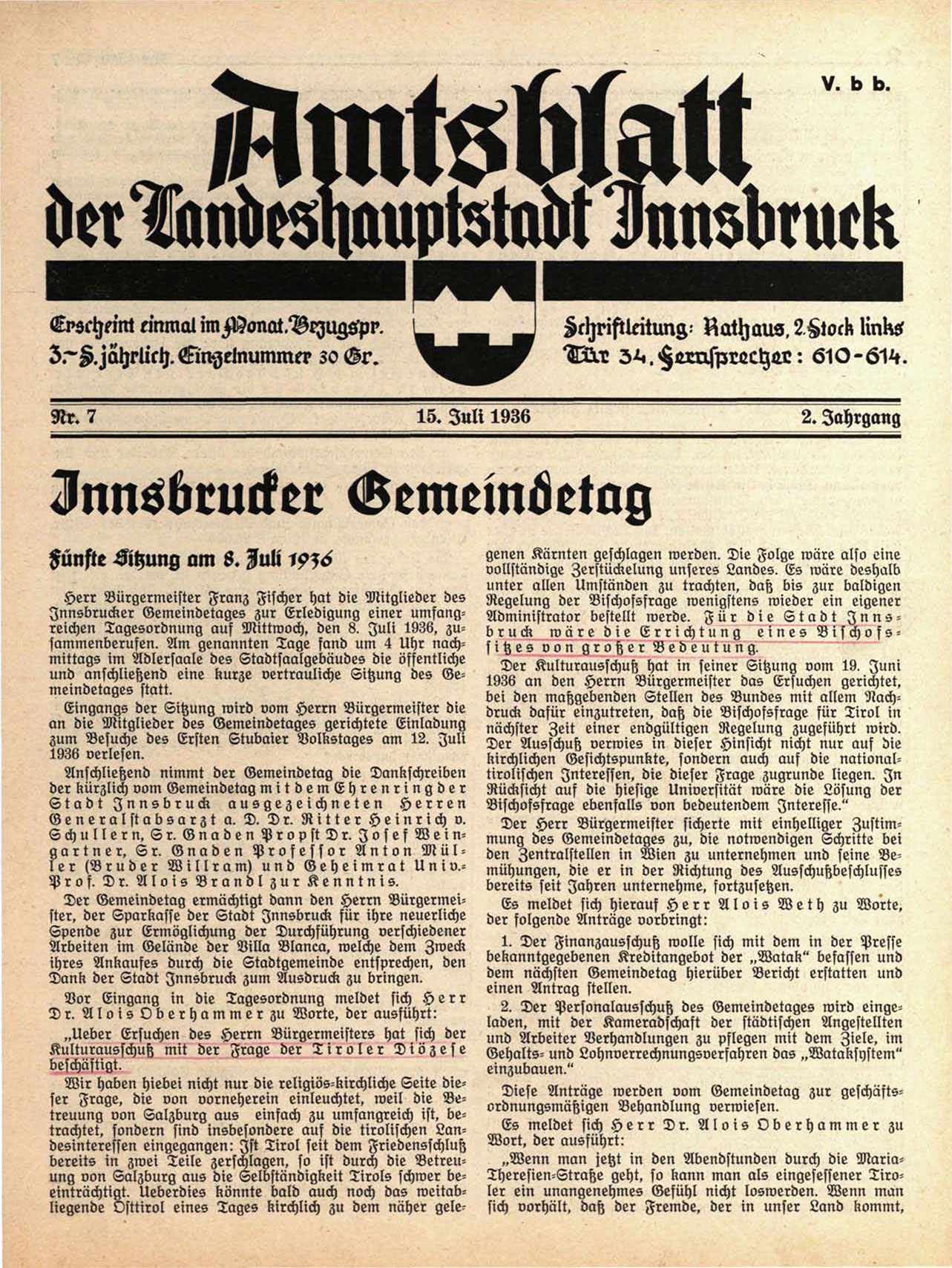 Innsbrucker Gemeindetages zur Erledigung einer umfangreichen Tagesordnung auf Mittwoch, den 8. Juli 1936, zusammenberufen. Am genannten Tage fand um 4 Uhr nachmittags im Adlersaale des Stadtfaalgebäudes die öffentliche