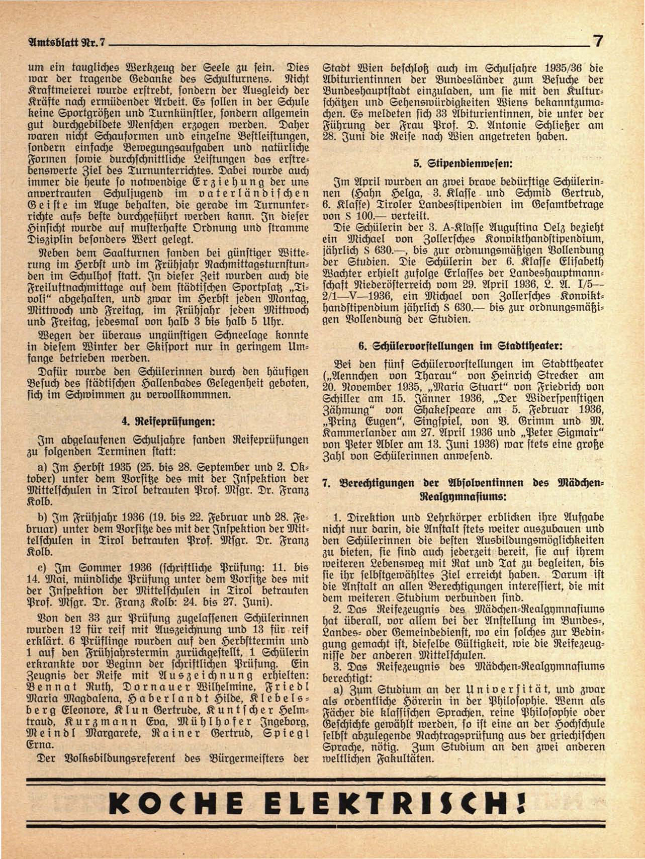 d) I m Frühjahr 1936 (19. bis 22. Februar und 28. Februar) unter dem Vorsitze des mit der Inspektion der Mittelschulen in Tirol betrauten Prof. Msgr. Dr. Franz