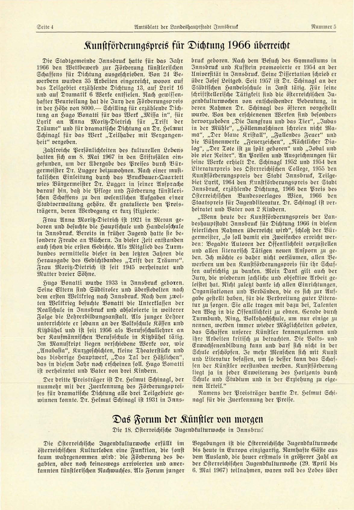 „Wenn heute der Kunstförde rungs preis der Landeshauptstadt Innsbruck für Dichtung 1966 in diesem