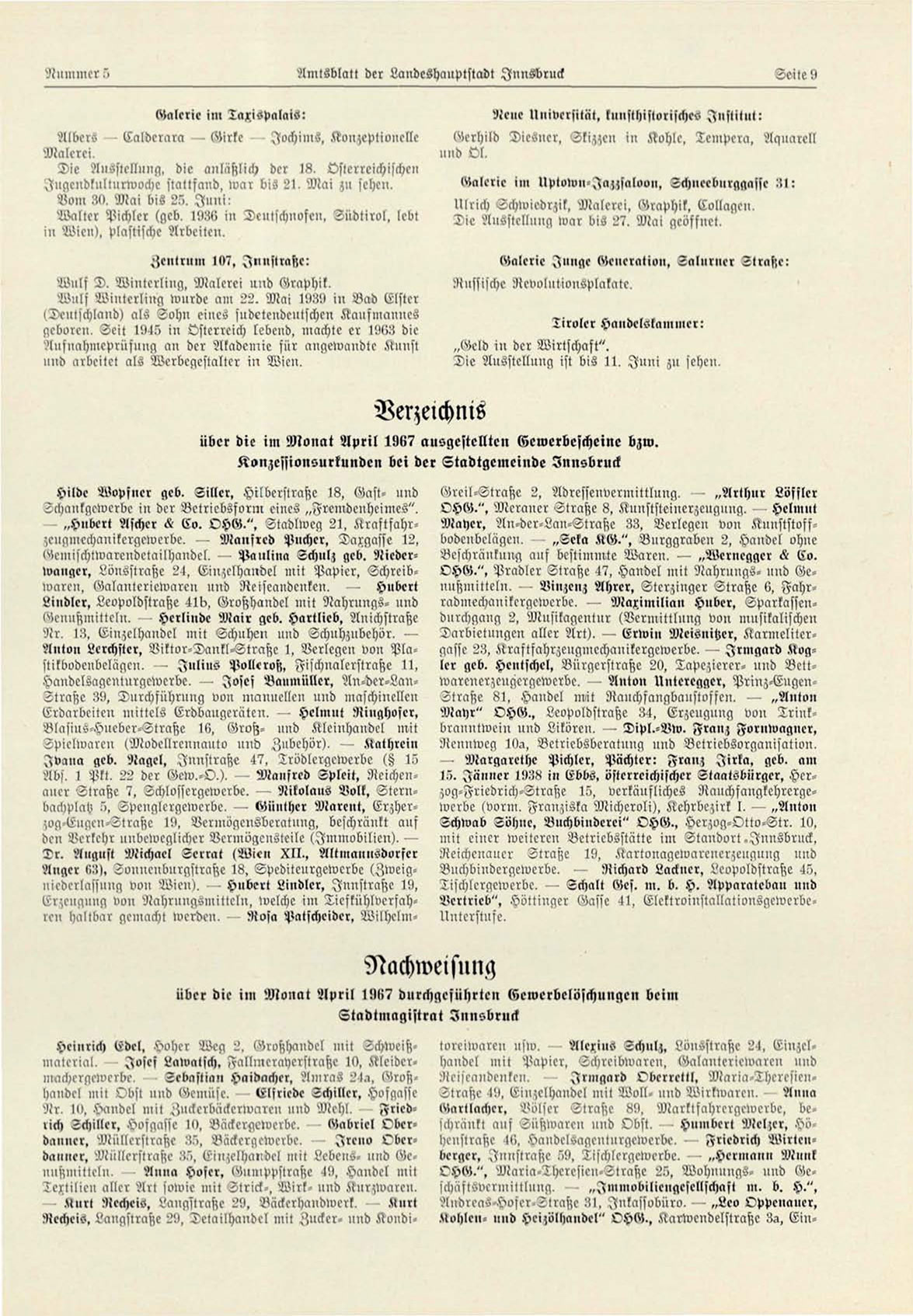 OHG.", Pradler Straße 47, Handel mit Nahrnngv- und Genußmittcln. -^ Vinzenz Ahrer, Sterzinger Straße 6, Fahrradmechanikcrgewcrbe. — Maximilian Huber, Sparkasscndurchgang 2, Mnsikagentnr (Vermittlung von musikalischen