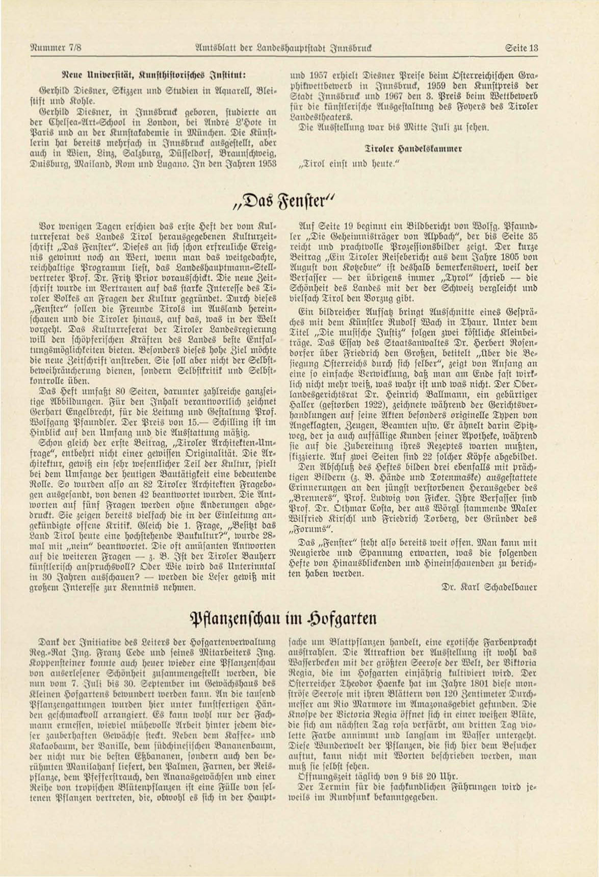 Vor weuigcu Tagcu erschien das erste Heft der vom K u l lurrcferat des Laudes T i r o l herausgegebenen Kulturzeitschrift „Das Fcuster". Dieses an sich schon erfreuliche Erciguis gcwiuut uoch au Wert, wenn man das weitgedachte,