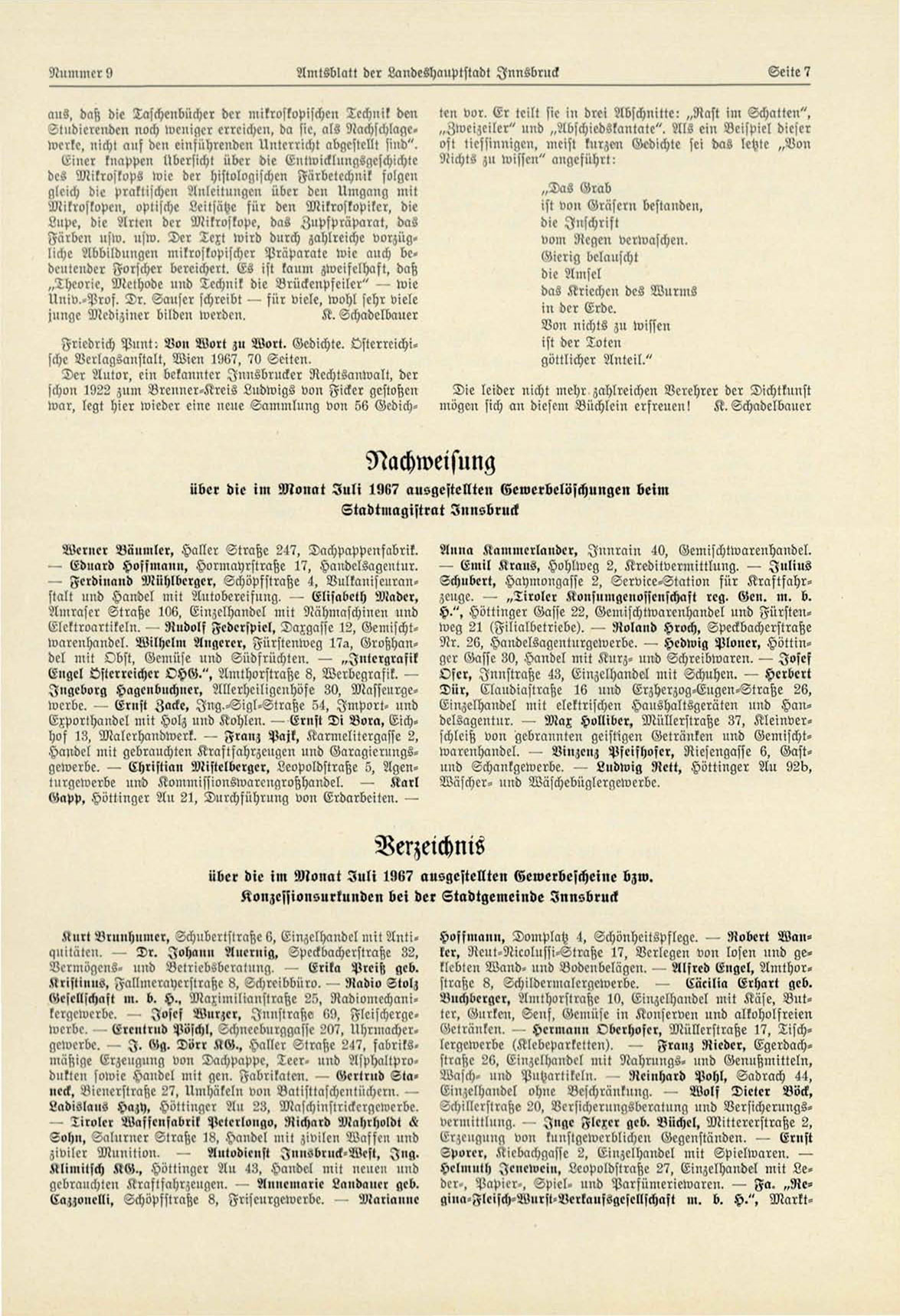 Einzelhandel mit elektrischen Hanshaltsgeräten nnd Handelsagentur. — Max Holliber, Müllerstratze 37, Kleinberschlciß von gebrannten geistigen Getränken und Gemischtwarcnhandel. — Vinzenz Pfeifhofer, Niescngasse 6, Gaftnnd Schankgewerbe. — Ludwig Nett, Höttinger A u 92b,