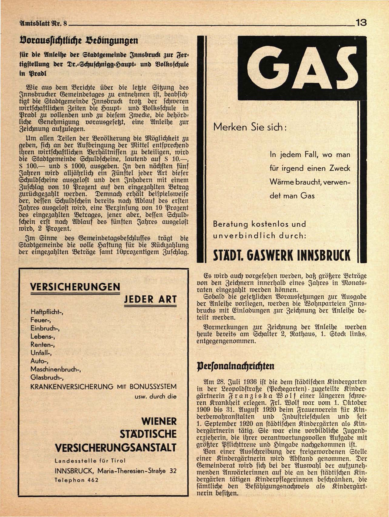 für die Anleihe der Stadtgemeinde Innsbruck zur Fertigstellung der Dr.-Schuschnigg-Haupt- und Volksschule