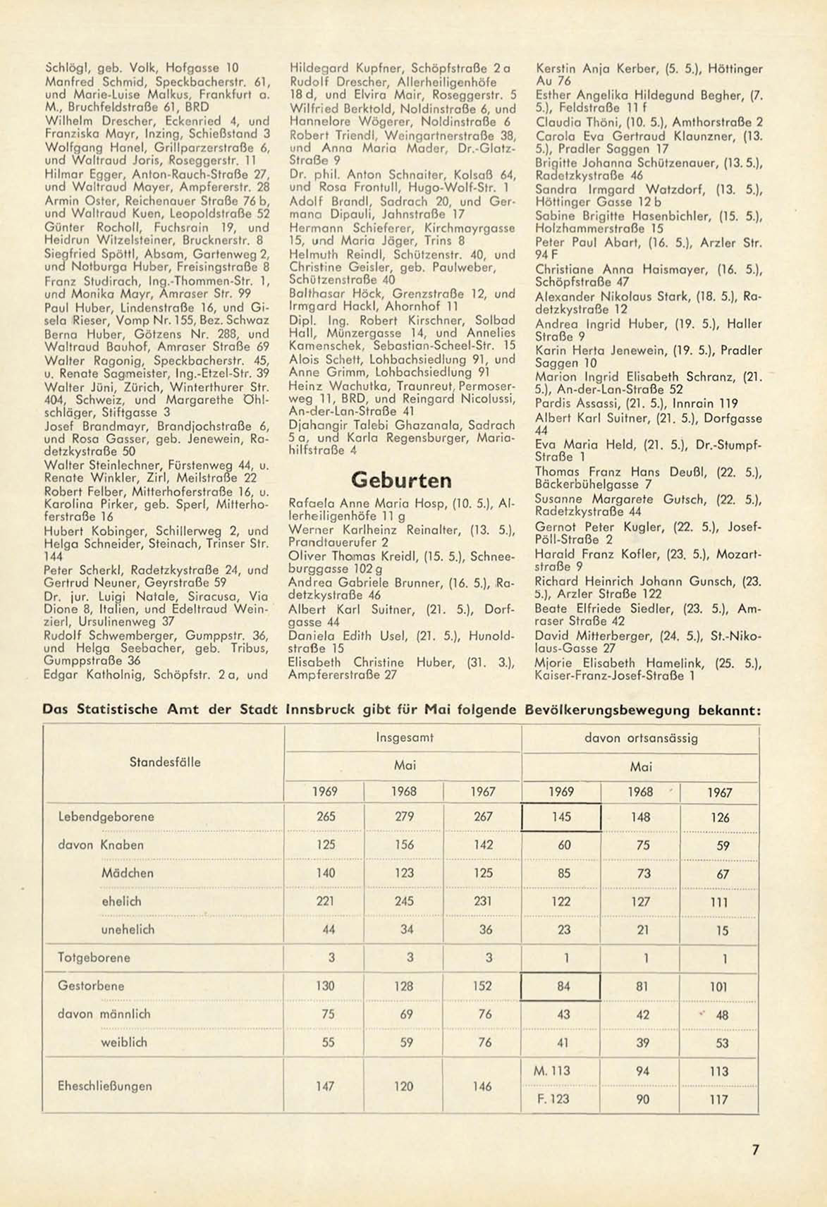 der Stadt Innsbruck gibt für Mai folgende Bevölkerungsbewegung