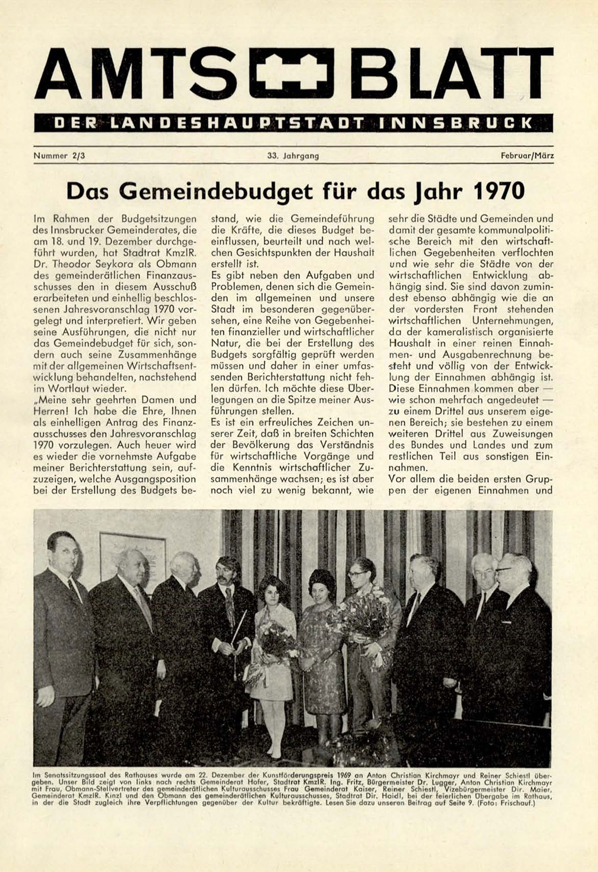 Im Senatssitzungssaal des Rathauses wurde am 22. Dezember der Kunstföiderungspreis 1969 an Anton Christian Kirchmayr und Roiner Schiestl übergeben. Unsor Bild zeigt von links nach rechts Gomeinderat Hofer, Stadtrat KmzIR. Ing. Fritz, Bürgermeister Dr. Lugger, Anton Christian Kirchmayr