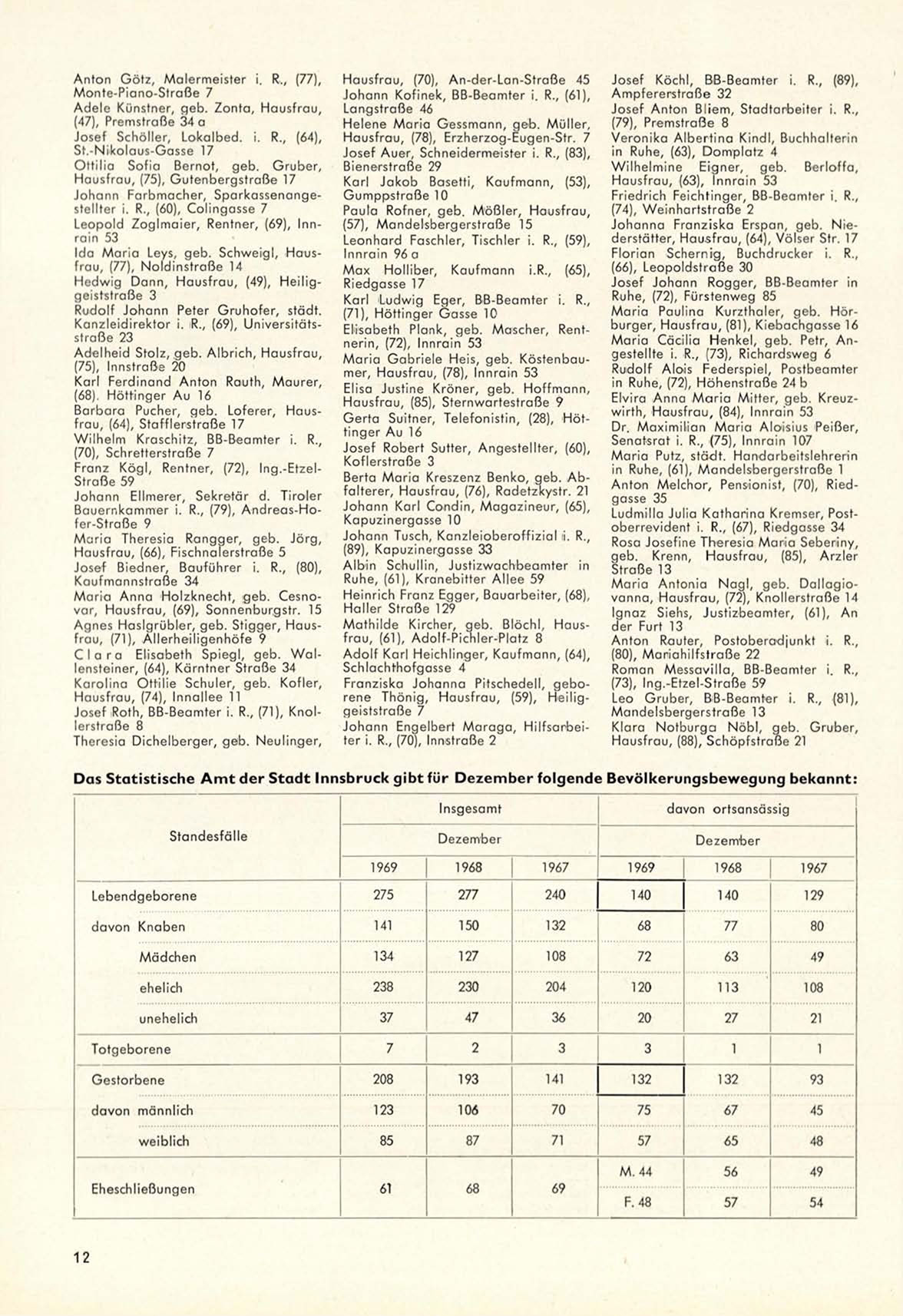 Das Statistische A m t der Stadt Innsbruck gibt für D e z e m b e r folgende B e v ö l k e r u n g s b e w e g u n g