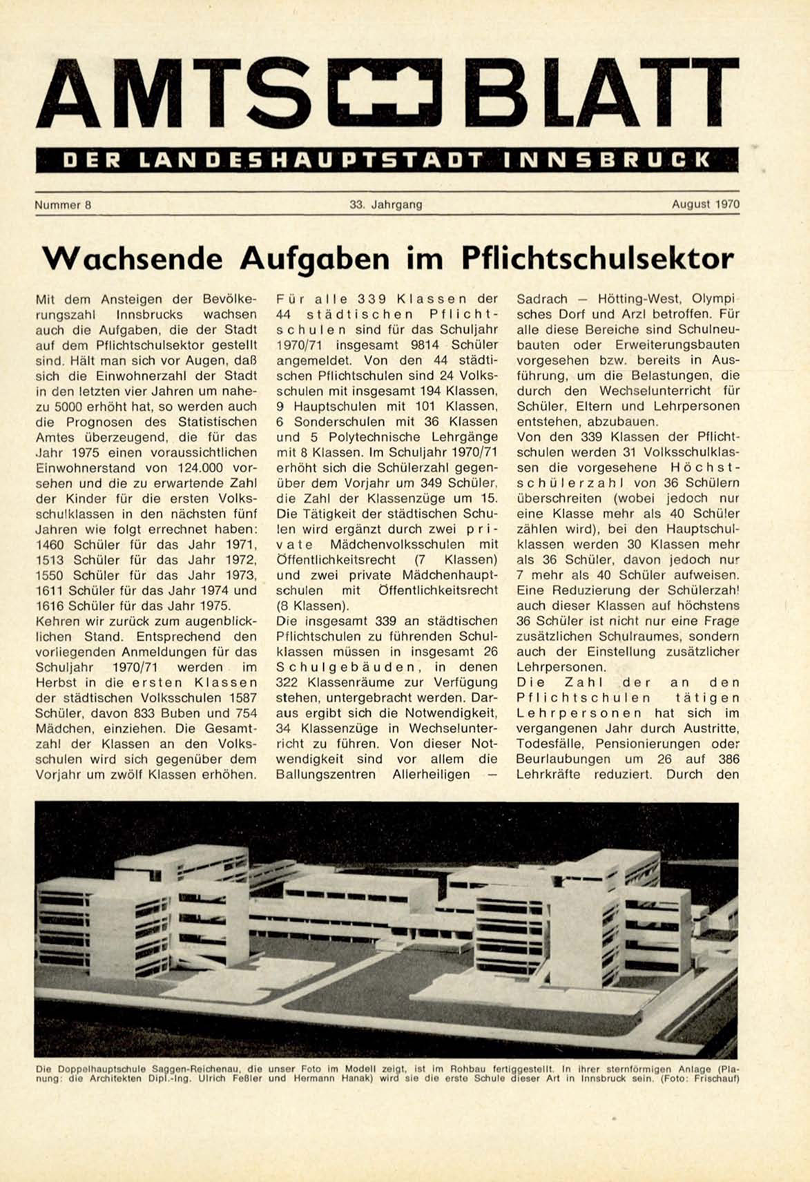 S a g g e n - R e i c h e n a u , die u n s e r Foto im M o d e l l zeigt, ist Im R o h b a u fertiggestellt. In ihrer sternförmigen A n l a g e (PlaDipT.-Ing. Ulrich Feßler und Hermann Hanak) wird s i e die erste Schule d i e s e r Art in Innsbruck s e i n . (Foto: Frischauf)