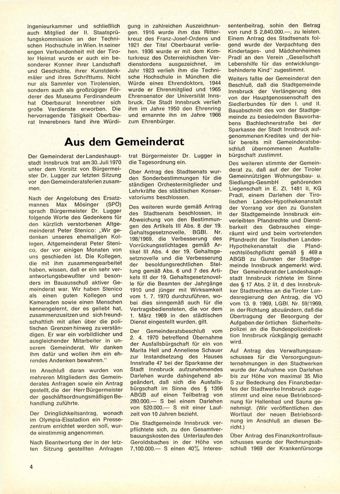 Der G e m e i n d e r a t der L a n d e s h a u p t stadt Innsbruck trat am 30. Juli 1970