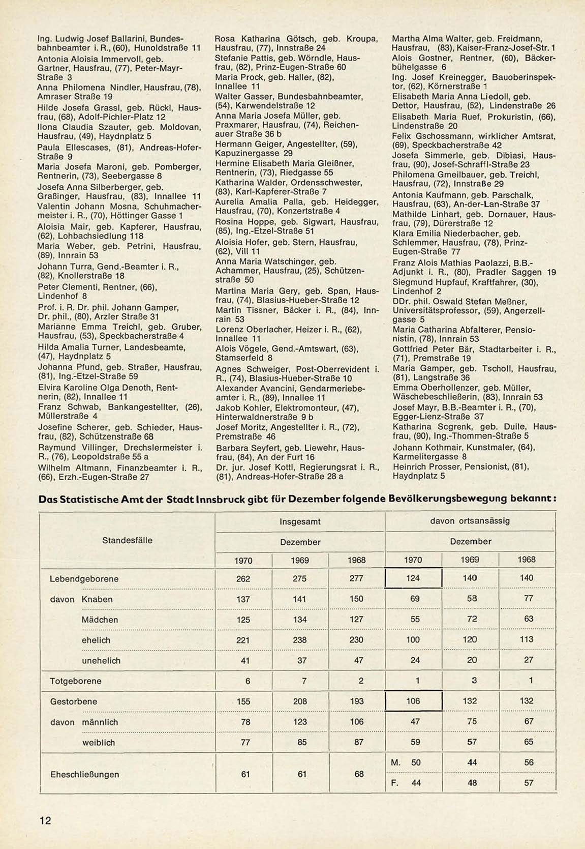 Das Statistische Amt der Stadt Innsbruck gibt für Dezember folgende Bevölkerungsbewegung bekannt: