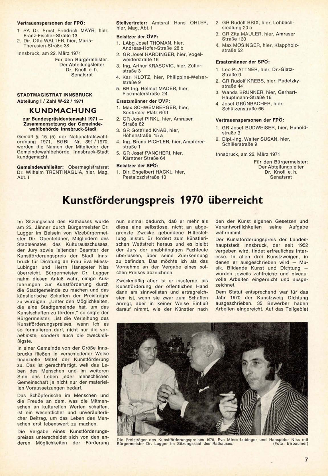 K u n s t f ö r d e r u n g s p r e i s der Stadt Innsbruck für Dichtung an F r a u E v a M i e s s L u b i n g e r und Herrn H a n s p e t e r N i s s