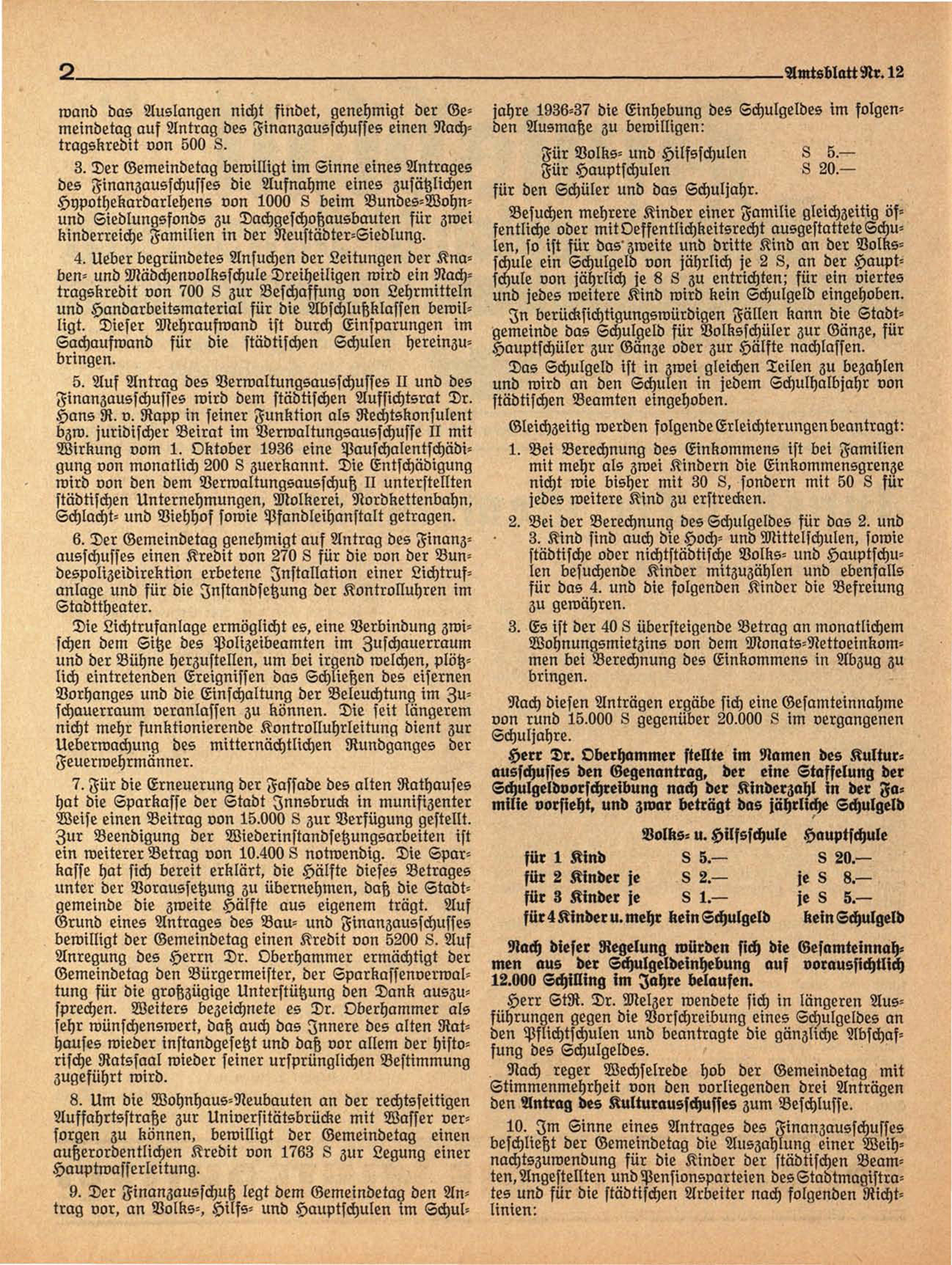 jahre 1936-37 die EinHebung des Schulgeldes im folgenden Ausmatze zu bewilligen: