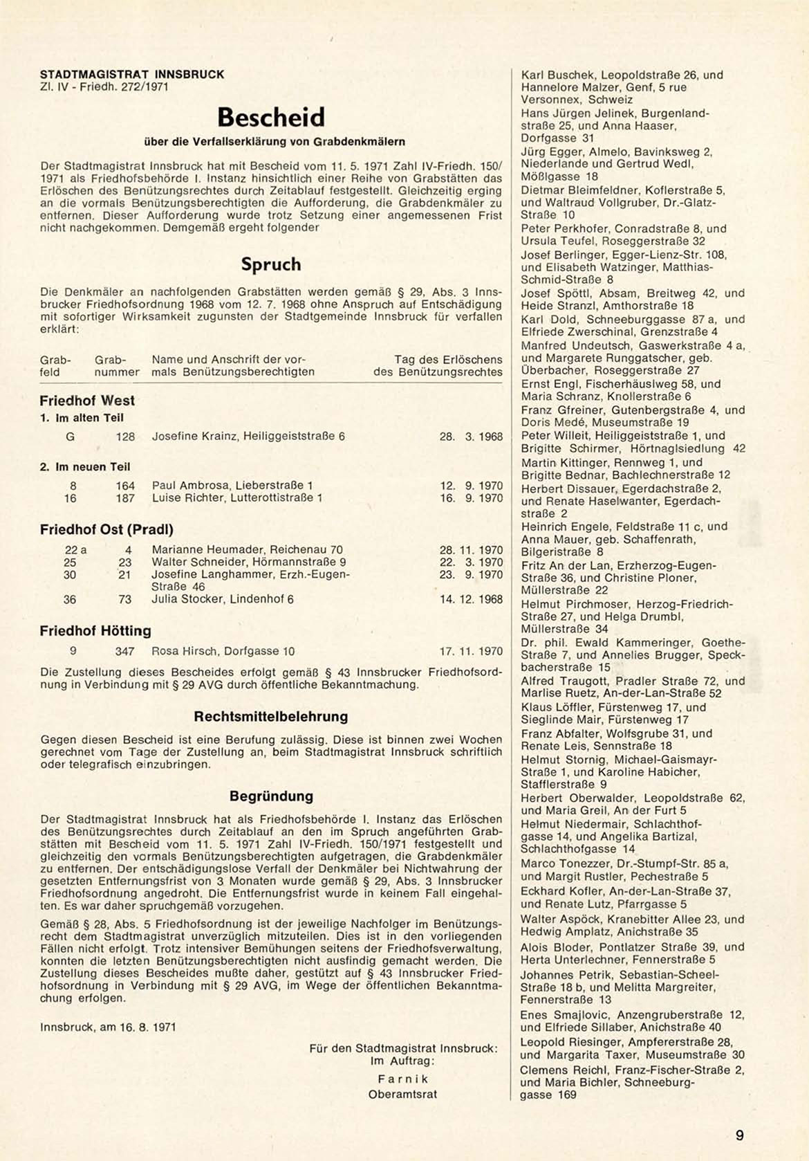 Die Denkmäler an n a c h f o l g e n d e n Grabstätten w e r d e n gemäß § 29, A b s . 3 Innsbrucker F r i e d h o f s o r d n u n g 1968 vom 12. 7. 1968 o h n e A n s p r u c h auf Entschädigung