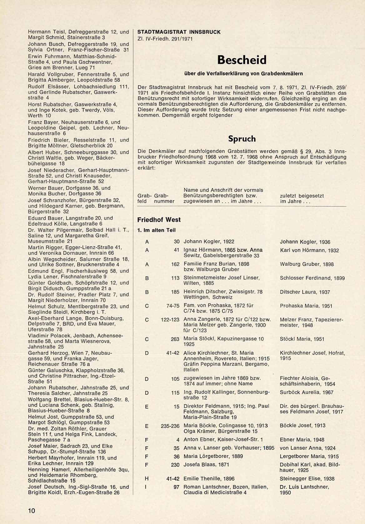 Der Stadtmagistrat Innsbruck hat mit B e s c h e i d v o m 7. 8. 1971, ZI. IV-Friedh. 259/
